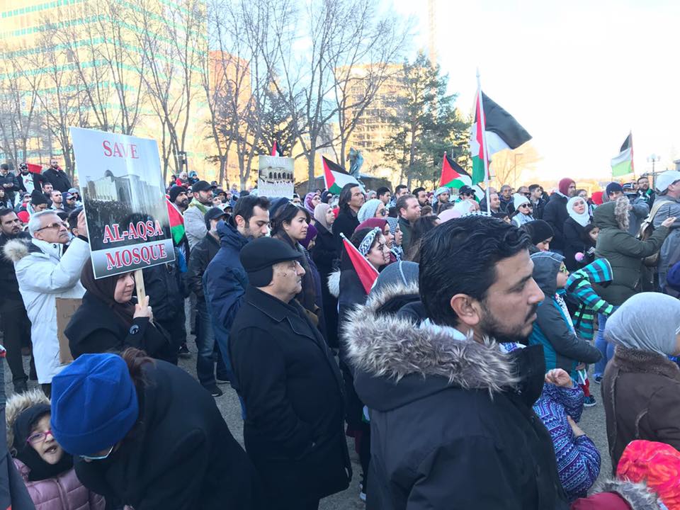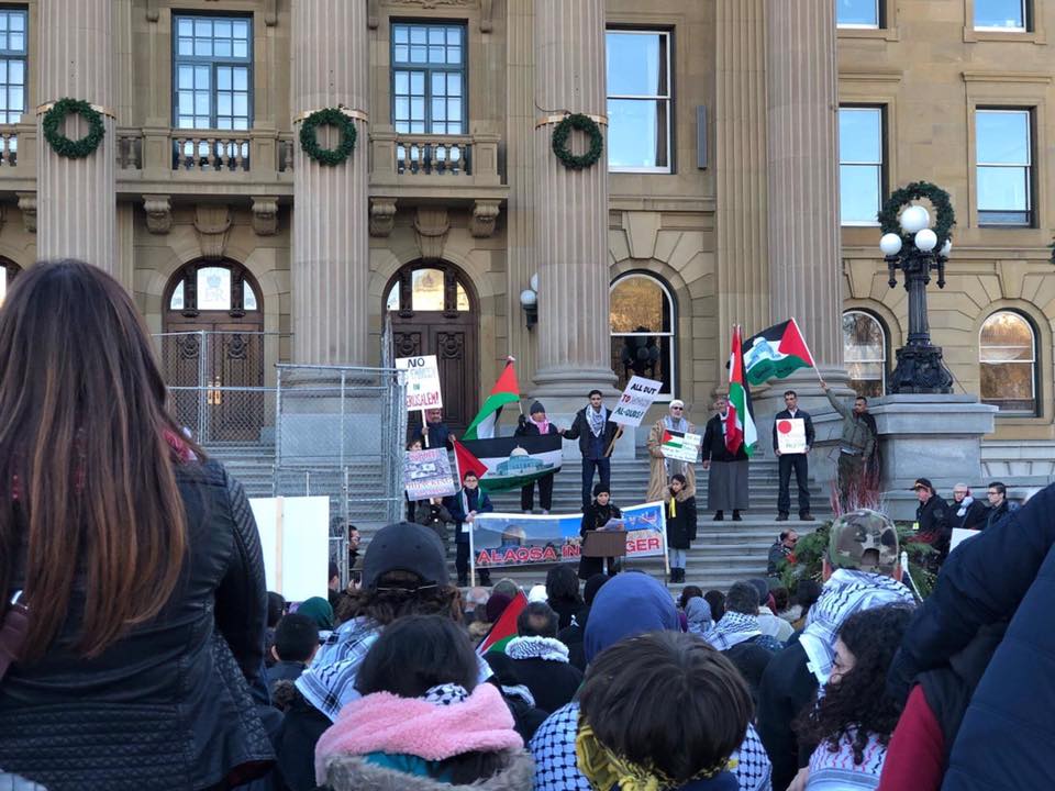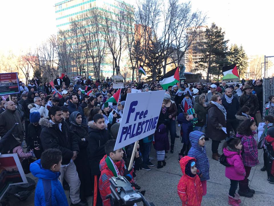 The Palestinian community in Edmonton, Alberta organized a demonstration that drew hundreds of participants to the grounds of the Alberta Legislature in protest of the declaration of U.S. President Donald Trump regarding Jerusalem. Under the slogan of “Hands off Jerusalem,” the Canada Palestine Cultural Association brought together Palestinians and supporters of Palestine to stand in solidarity with the liberation movement.