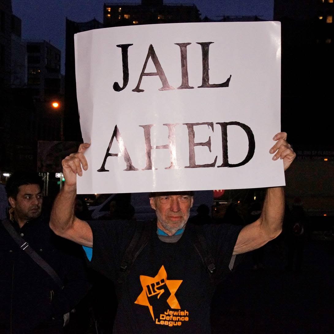 A few far-right Zionist counterprotesters from the Jewish Defense League appeared at the protest to hold signs cheering for U.S President Donald Trump and reading “Jail Ahed.” The JDL is infamous for its racism as well as its violence; a JDL member was recently indicted in Washington, DC for a hate attack on a Palestinian man protesting AIPAC and the JDL was implicated in the assassination of Arab American community leader Alex Odeh. They attempted to provoke and taunt protesters by calling for the imprisonment of Palestinian children and shouting “God bless Trump.”