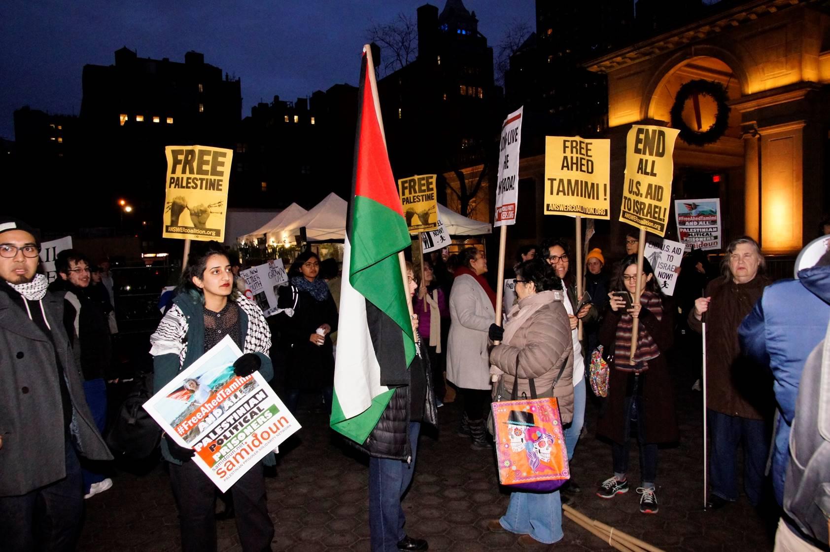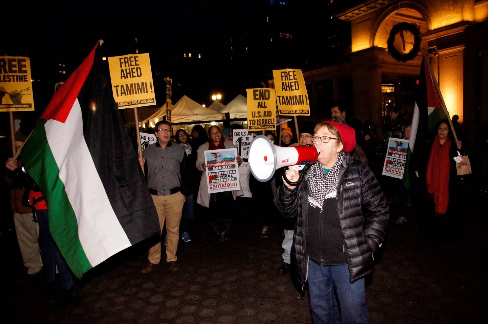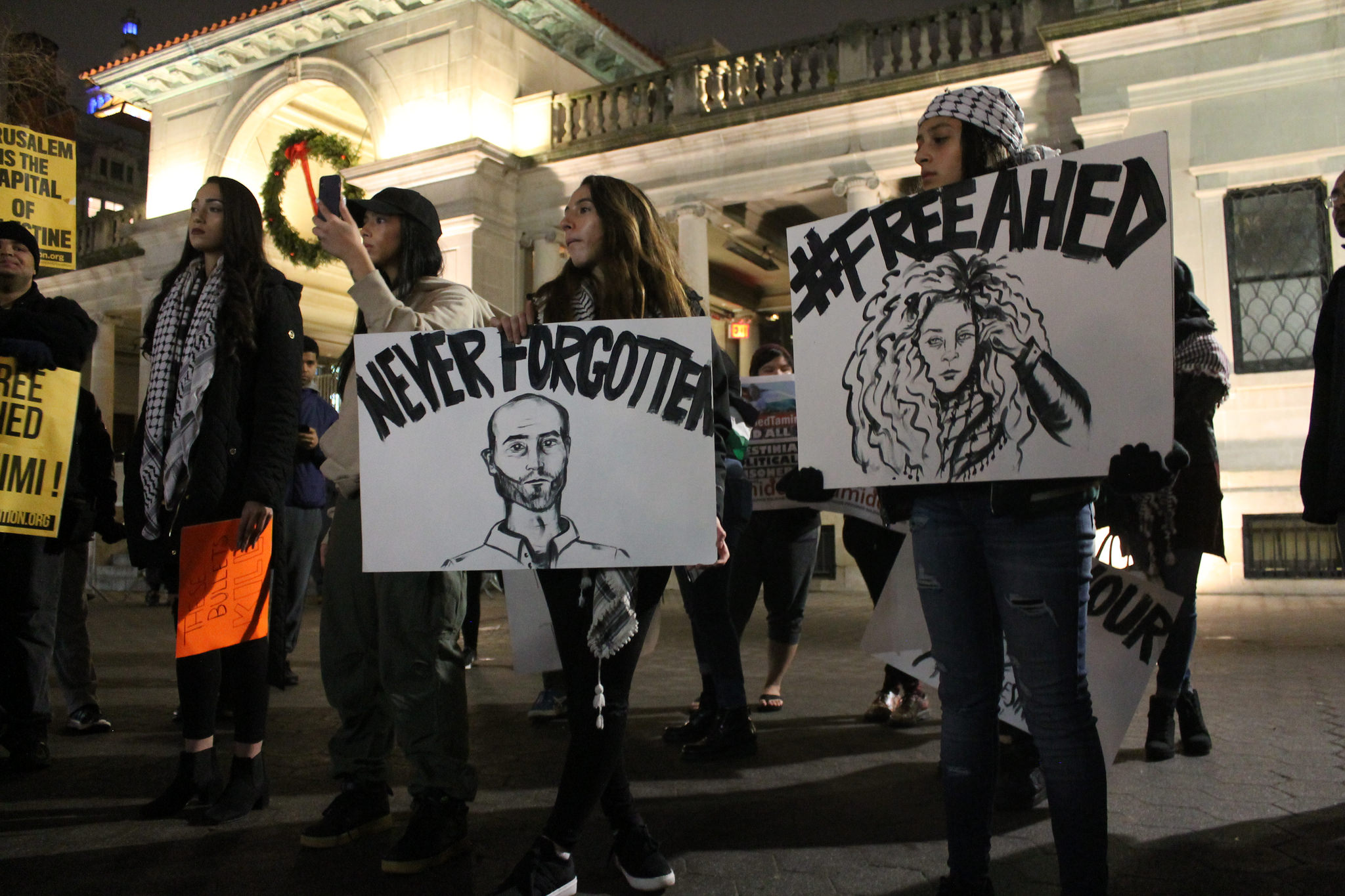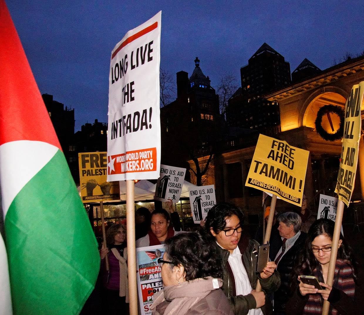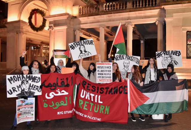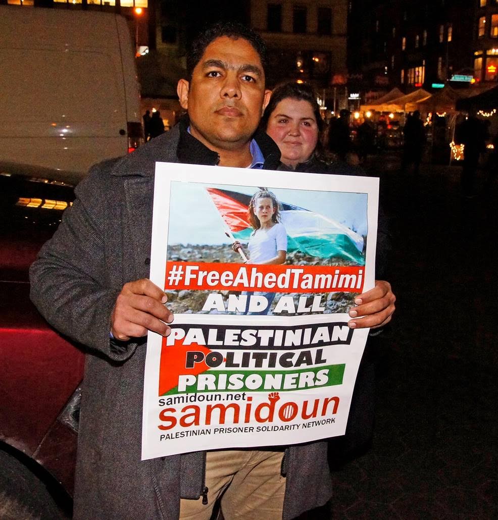 The NY4Palestine coalition organized a demonstration on Friday, 22 December in Manhattan’s Union Square to demand freedom for detained Palestinian teen Ahed Tamimi and fellow Palestinian child prisoners, including detained boy Abdul-Khalik Burnat. The protest highlighted the attack on the Tamimi family, including the detentions of Ahed’s mother, Nariman Tamimi, and cousin, Nour Tamimi. The Tamimi women are leaders in the indigenous anti-colonial Palestinian resistance in the village of Nabi Saleh, where they organize to defend the agricultural village’s land and water from frequent attacks by Zionist occupation soldiers and settlers.