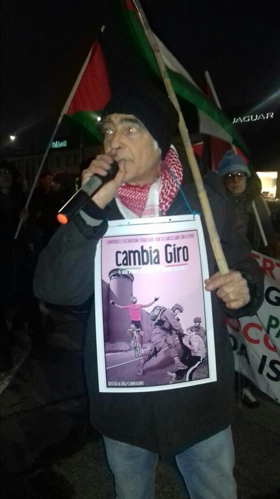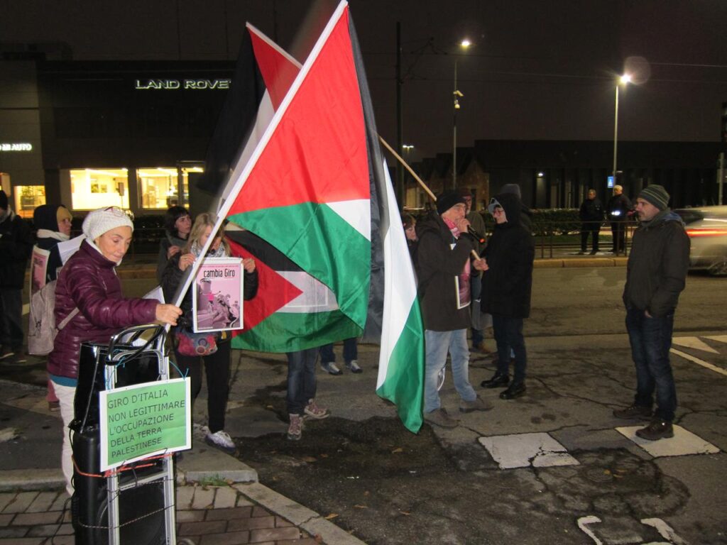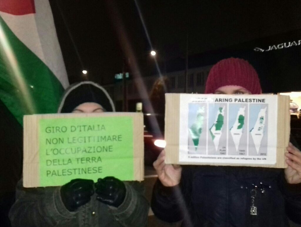 On 29 November 2017 in the late afternoon, the Coordinamento Lombardo per la Palestina, a group that includes Fronte Palestina, BDS Milan , Salaam Ragazzi dell’Olivo Milano and other organizations and individuals committed to supporting the Palestinian struggle, organized a protest outside the entrance of RAI Television Studios (the Public Italian broadcasting company) to protest during the official presentation of the world-class cycling event Giro d’Italia. The Giro d’Italia is subject to international protests and an escalating Palestinian, Italian and international campaign to move the race, which has been scheduled to start in occupied Jerusalem under the auspices of the Israeli occupation.