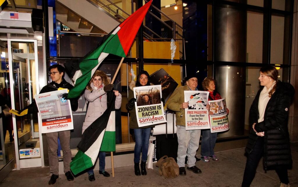 Protesters gathered outside the Best Buy electronics store in Manhattan’s Union Square on Monday evening, distributing flyers and leaflets to passers-by on the busy holiday shopping evening. The electronics store sells many HP consumer products, including laptops, tablets, printers, ink and computer accessories. HP corporations have contracts with a range of Israeli security and military agencies.