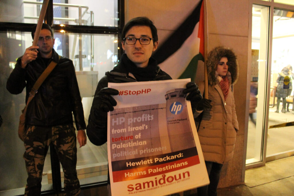 There is a growing global movement to boycott HP and demand the corporation cut ties with the occupation. Churches, labor organizations, student groups and others have declared themselves HP-free zones, refusing to buy HP products until the corporation ends its profiteering from Israeli apartheid and colonization. Participants in the protest carried signs about HP’s role in propping up the Israeli assault on Palestinians and handed out leaflets with information on the HP boycott.