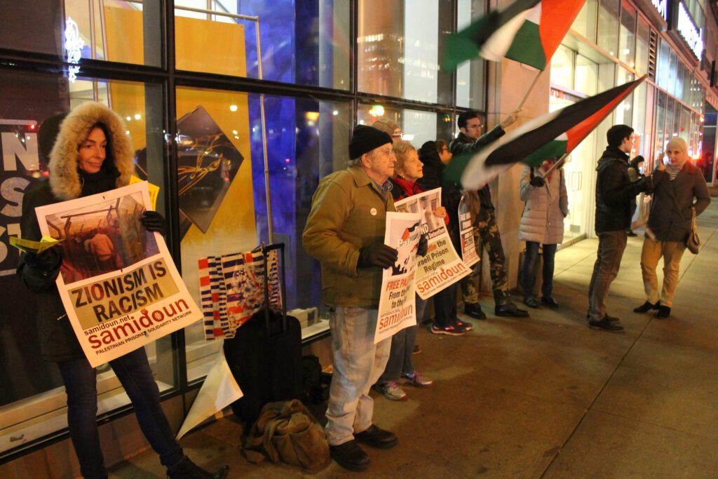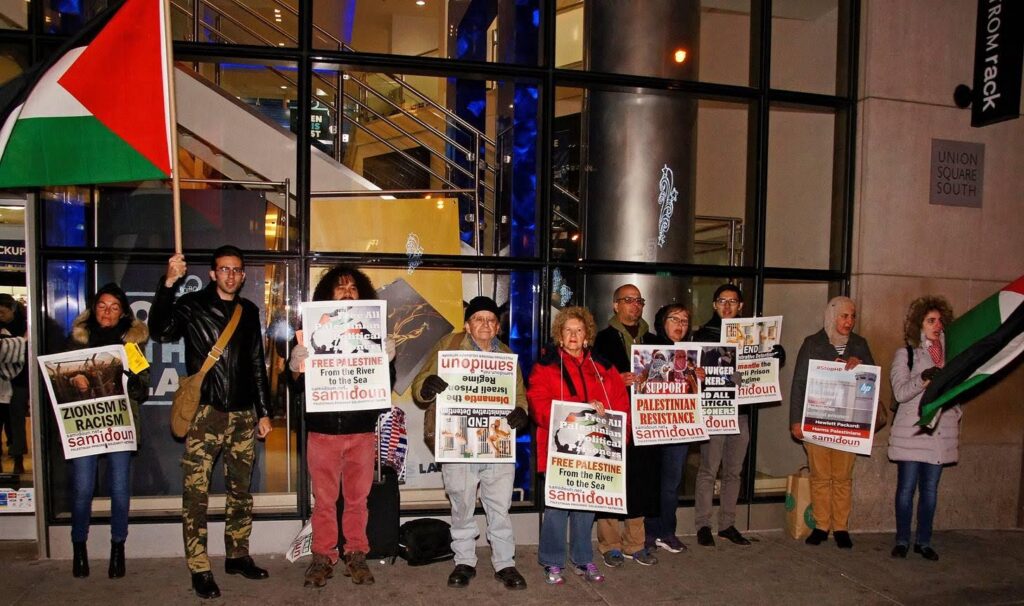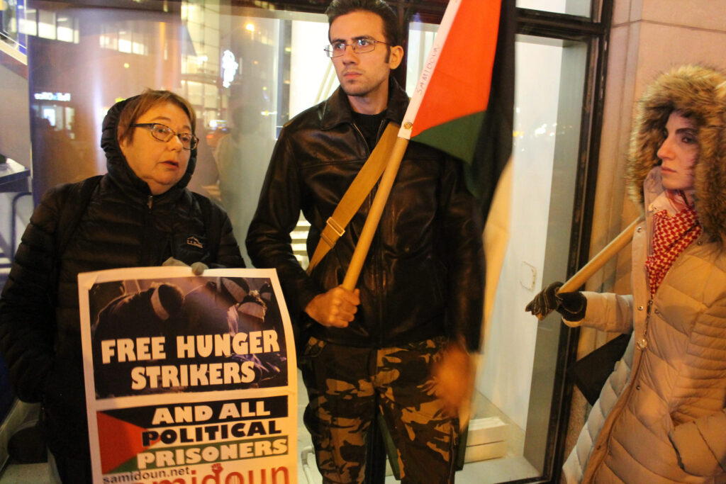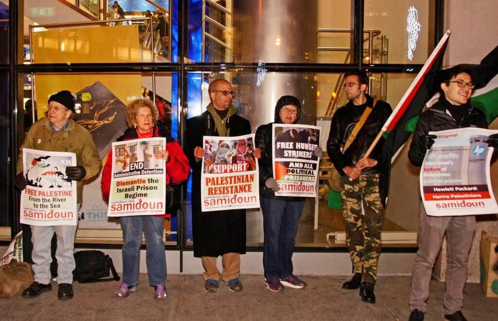 Samidoun activists in New York City organized a protest on Monday, 27 November to support imprisoned Palestinian hunger striker Salah al-Khawaja and all Palestinian prisoners. The protest also came as part of global actions in support of the boycott of Hewlett-Packard (HP) corporations for its involvement in profiteering from and selling technology to sustain the occupation, oppression and colonization of Palestine.