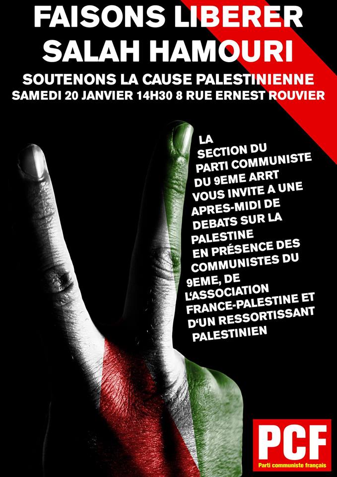 The PCF section of the 9th arrondisement of Marseille invites you to an afternoon of discussions and actions in support of freedom for Salah Hamouri and support for the Palestinian cause.