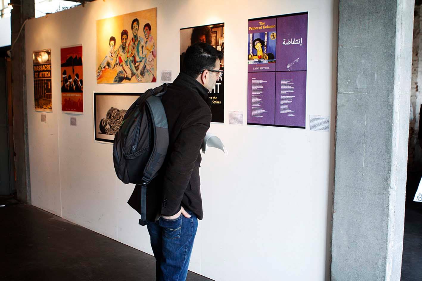 The festival’s framework was inspired by the work of professor Greg Thomas, whose exhibition on “George Jackson in the Sun of Palestine” served as the centerpiece and driving theme of the events of the week. The exhibition, which was mounted in the main hall at De Expeditie in Ghent, includes poster art, letters, book covers and other material that highlight the life and death of Black Panther and prisoner leader George Jackson, assassinated in prison in 1971. Among his books and possessions were Palestinian poems by Palestinian poet and freedom struggler Samih al-Qasem. The exhibition looks at Black-Palestinian solidarity in light of resistance movements, prison organizing, poetry and art. It was first exhibited at the Abu Jihad Museum in Abu Dis and has since been shown in the African Community Center of Jerusalem, San Francisco, Vienna, Washington, DC, and elsewhere.