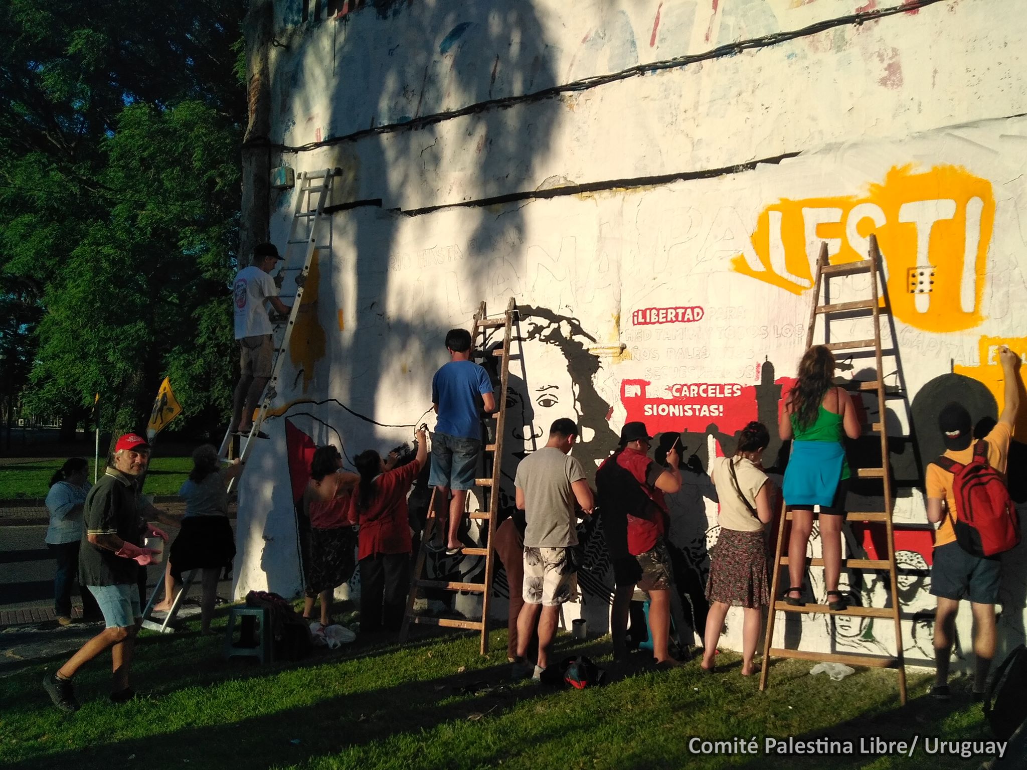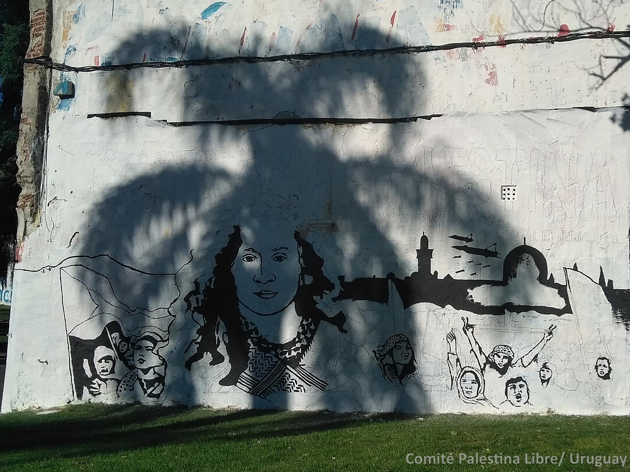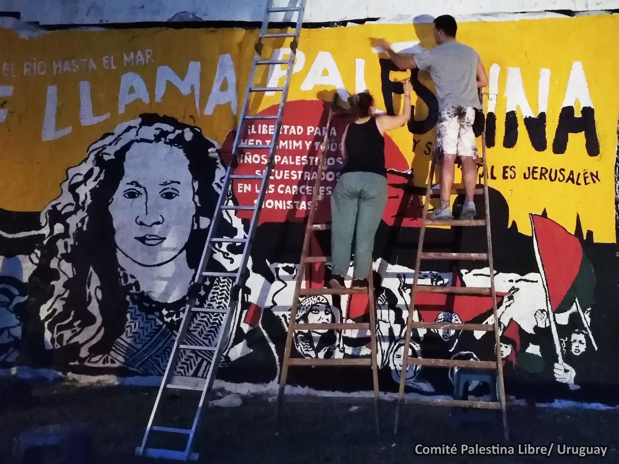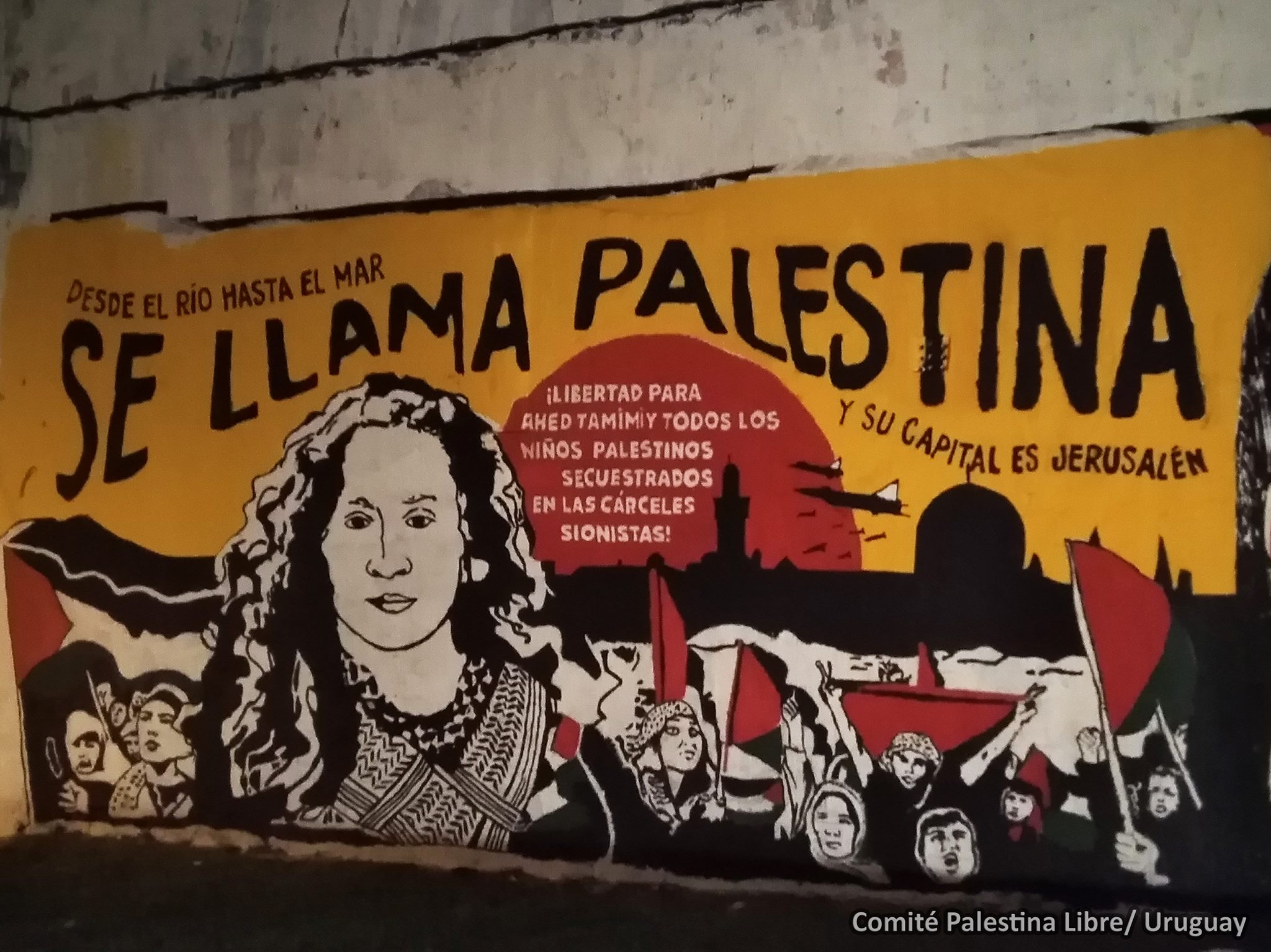 Organizers with the Comite Palestina Libre – Uruguay created a collective mural calling for freedom for Ahed Tamimi and her fellow Palestinian prisoners in Israeli jails on 19 January 2018. The mural, which features Ahed amid Palestinian flags, attacking fighter jets and the skyline of Jerusalem, also highlights the call for a free Palestine from the river to the sea with its capital in Jerusalem.