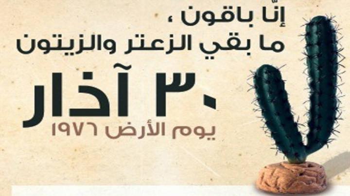 يوم الأرض الفلسطيني هو يوم يُحييه الفلسطينيون في 30 آذار من كلِ سنة، وتَعود أحداثه لآذار 1976 بعد أن قامت السّلطات الإسرائيلية بمصادرة آلاف الدّونمات من الأراضي ذات الملكيّة الخاصّة أو المشاع في نطاق حدود مناطق ذات أغلبيّة سكانيّة فلسطينيّة، وقد عم اضراب عام ومسيرات من الجليل إلى النقب، وأندلعت مواجهات أسفرت عن سقوط ستة شهداء فلسطينيين وأُصيب واعتقل المئات.يعتبر يوم الأرض حدثاً محورياً في الصراع على الأرض وفي علاقة المواطنين العرب بالجسم السياسي الإسرائيلي حيث أن هذه هي المرة الأولى التي يُنظم فيها العرب في فلسطين منذ عام 1948 احتجاجات رداً على السياسات الإسرائيلية بصفة جماعية وطنية فلسطينيةLand Day: March 30, is an annual day of commemoration for Palestinians of the events of that date in 1976. In response to the Israeli government’s announcement of a plan to expropriate thousands of dunams of land for security and settlement purposes, a general strike and marches were organized in Arab towns from the Galilee to the Negev. In the ensuing confrontations with the Israeli army and police, six Palestinian citizens were killed, about one hundred were wounded, and hundreds of others arrested.