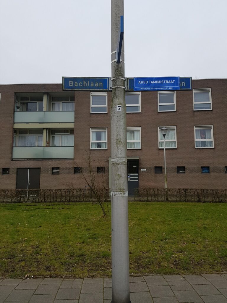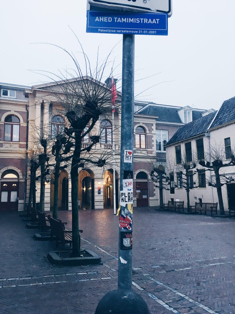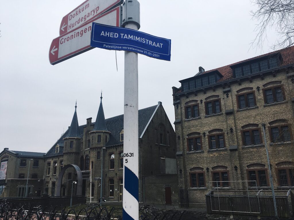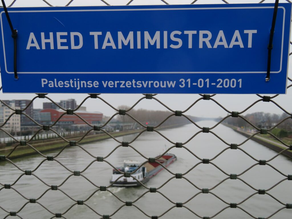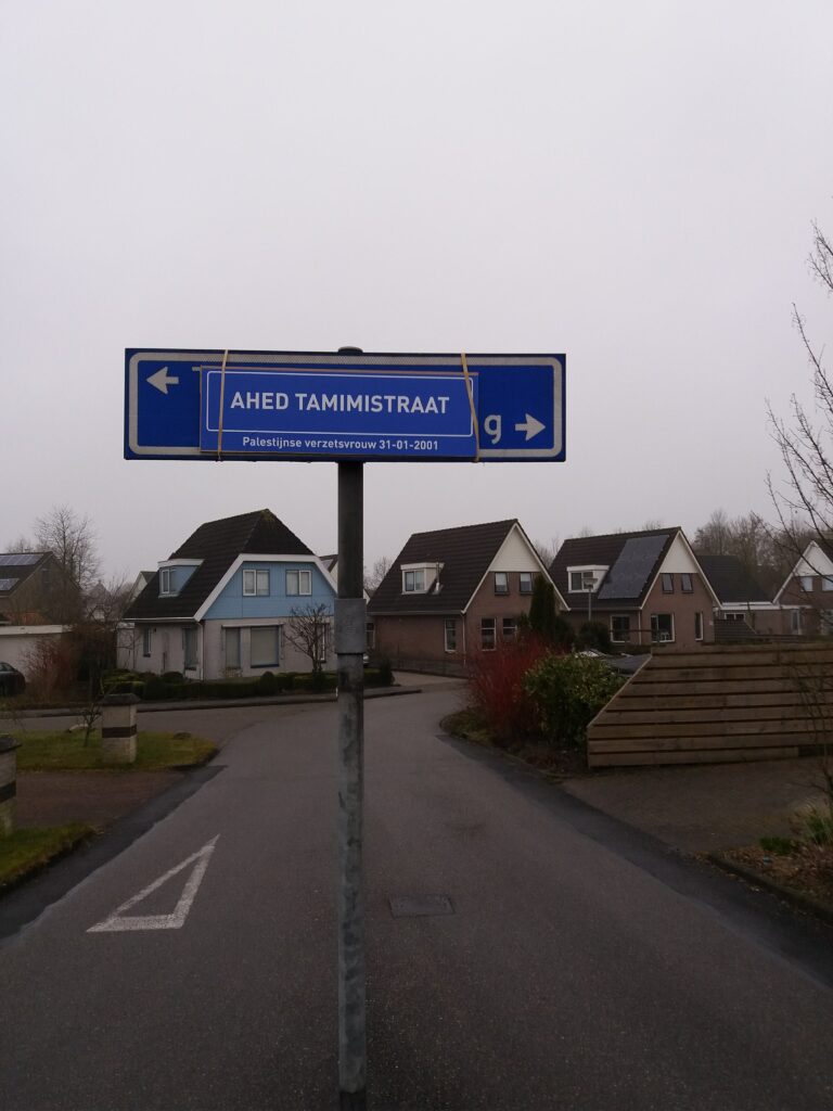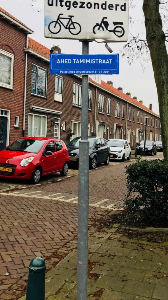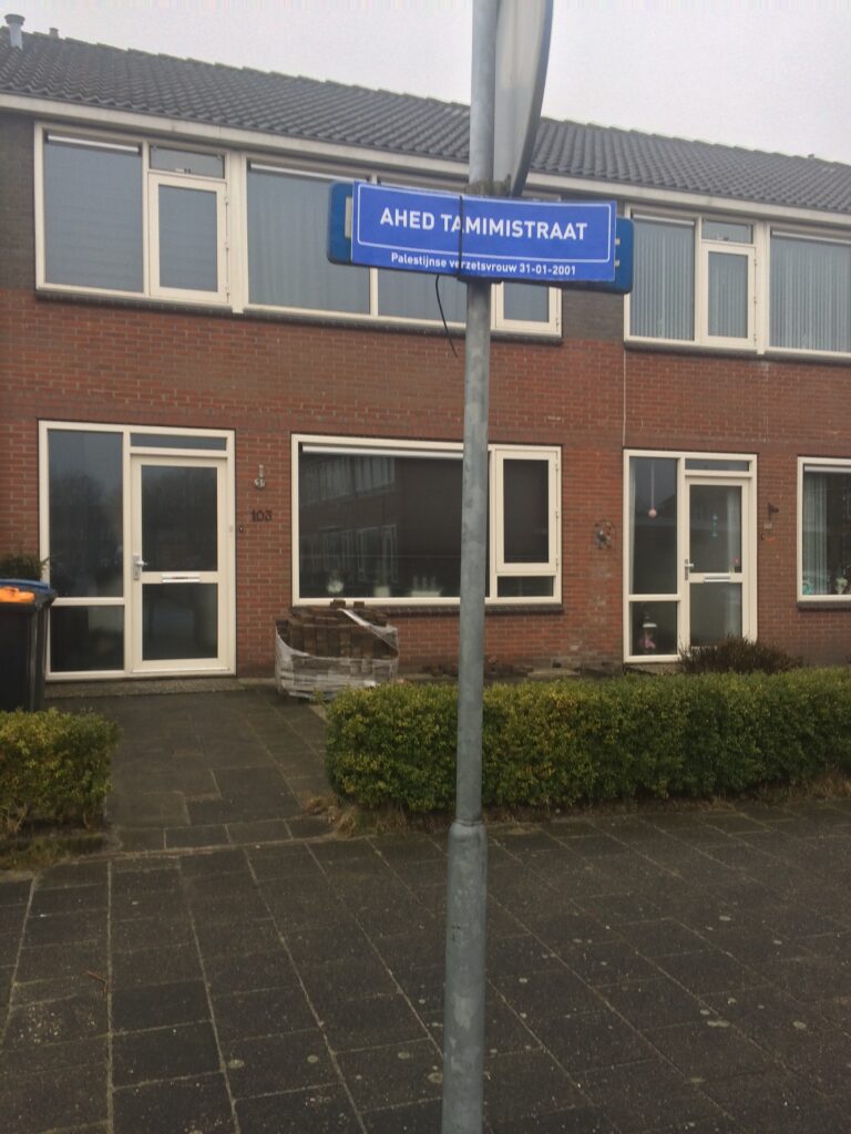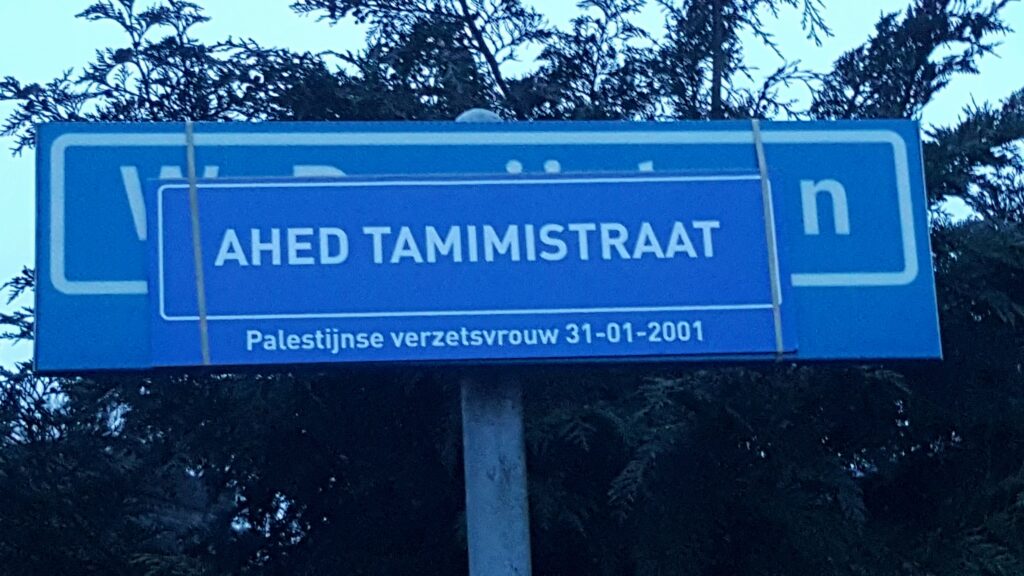 The organizers noted a particular likeness to Hannie Schaft, a heroine of the Dutch antifascist resistance. “Both are praised for their courage, and their striking hair. Hannie Schaft, herself a communist, was given the nickname ‘The girl with the red hair.’ Ahed Tamimi is famous for her striking blond curls and her free-spirited behaviour. In Leiden, therefore, Ahed Tamimi’s nameplate is placed in the Hannie Schaftstraat, joined to the nameplate of Hannie Schaft.”