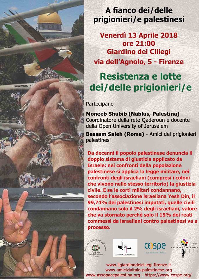 Assopace Palestina Firenze, Cospe Giardino dei Ciliegi e Associazione di Amicizia italo palestinese organizzano una serata per approfondire la situazione dei prigionieri palestinesi nelle carceri israeliane.