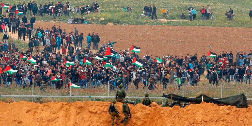 30. mars 2018 ble 30 000 fredelige demonstranter på Gazastripen møtt med skarpe skudd fra israelske snikskyttere. Minst 16 mennesker ble drept og mer enn 1400 såret da palestinere møtte opp til den Gandhi-inspirerte markeringen ”The Great Return March”. De palestinske demonstrasjonene skal vare frem til 15. mai.