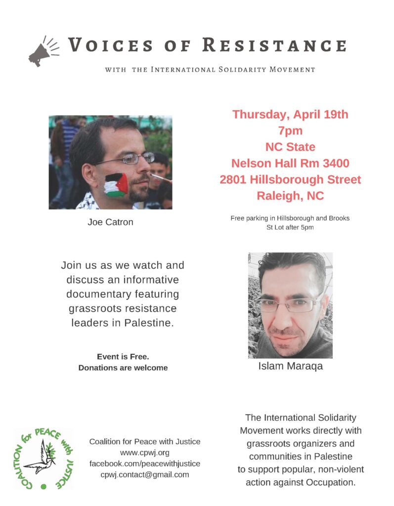 This event will feature speakers Joe Catron and Islam Maraqa. Join us as we watch and discuss an informative documentary featuring grassroots resistance leaders in Palestine.