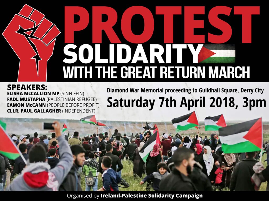 Speakers at the rally are Elisha McCallion, MP Sinn Fein. Fadl Mustapha, Palestinian Refugee and activist. Eamonn McCann, People Before Profit. Paul Gallagher, Independent Councillor Derry City & Strabane District Council. The leader of SDLP – Colum Eastwood has issued a statement in support of the aims of the Great March of Return. The SDLP party conference which is happening on the day of the rally prevents representatives from attending.