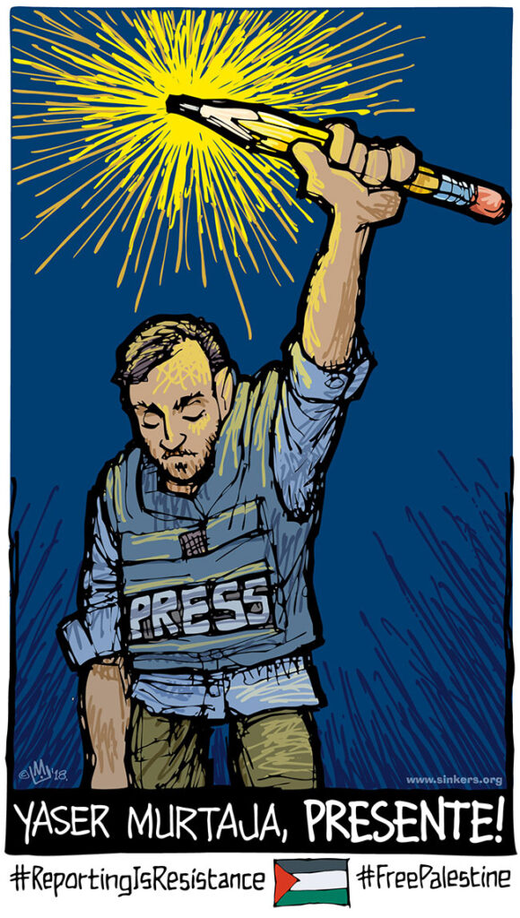 Samidoun Palestinian Prisoner Solidarity Network denounces the killing of Palestinian journalist Yaser Murtaja and notes that this killing takes place as part of a systematic attack on Palestinian journalists that includes targeting them for death, injury and imprisonment. Israeli occupation forces have repeatedly targeted journalists, and Palestinian journalists are routinely subjected to imprisonment, frequently administrative detention without charge or trial. The cases of Mohamed al-Qeeq, Omar Nazzal and Bushra al-Tawil are three among dozens that underline this policy, alongside historic assassinations of Palestinian writers like that of groundbreaking novelist, writer and revolutionary Ghassan Kanafani in 1972. The work, the images and the words of Palestinian journalists are critical in sharing the Palestinian experience, narrative and struggle with the Palestinian people, the Arab world and international audiences. Palestinian journalists must receive international solidarity and Israeli occupation forces must be held accountable, including through global sanctions and an arms embargo, for their targeting of Palestinians who document the stories of their people.