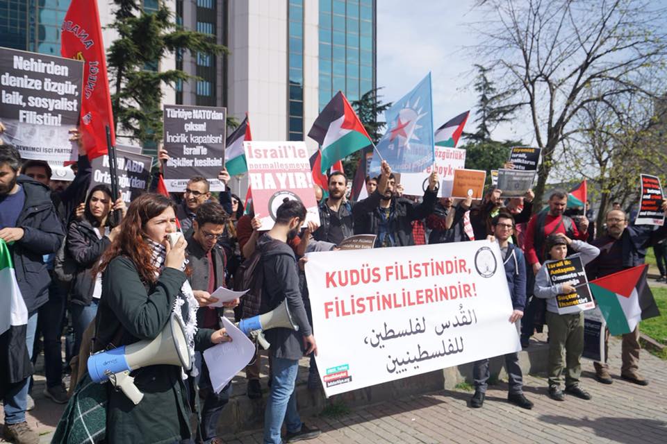 In Istanbul, BDS Turkey organized a demonstration on 30 March to commemorate Land Day and protest the move of the U.S. embassy to Jerusalem. Protesters gathered to support Palestine and denounce U.S. imperialism. They read a press statement in Arabic and Turkish in front of the Israeli consulate. The organizers also protested in solidarity with the Great Return March and to honor the Palestinians killed by occupation forces in Gaza.