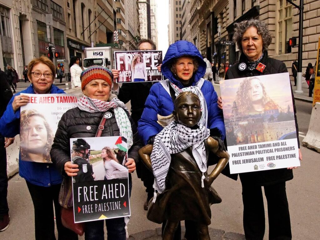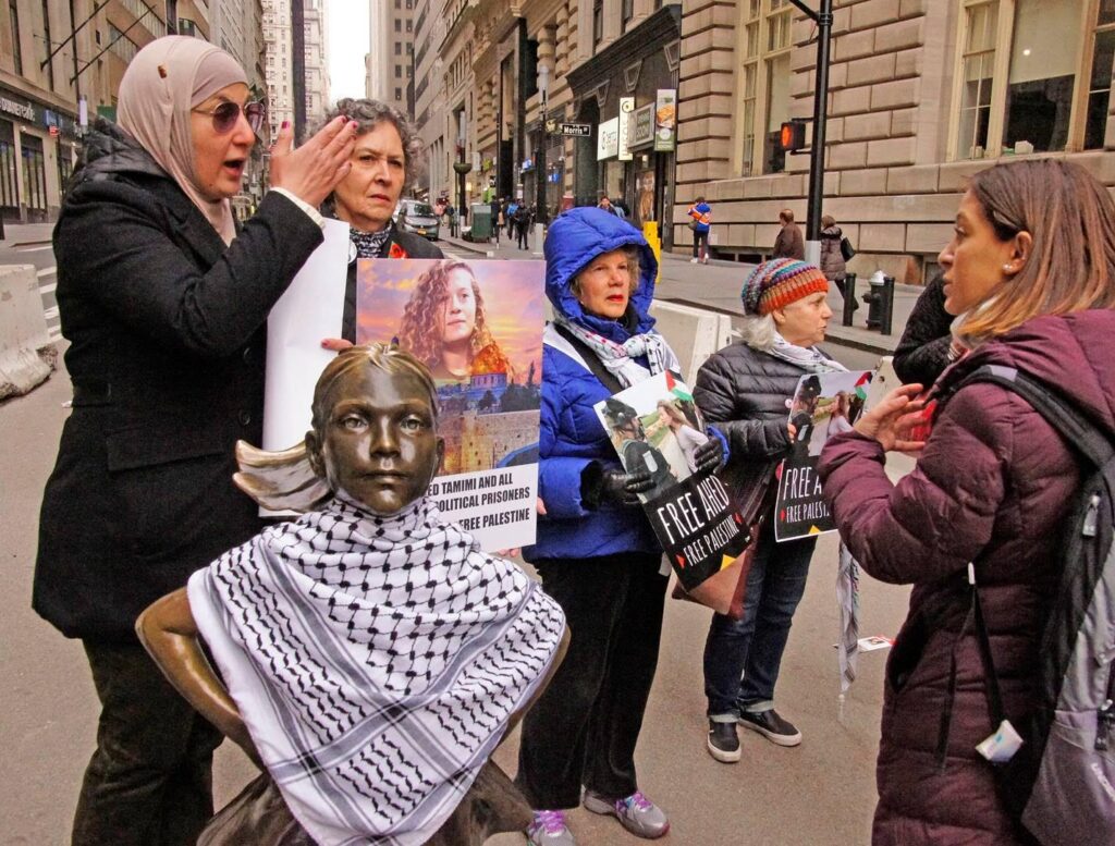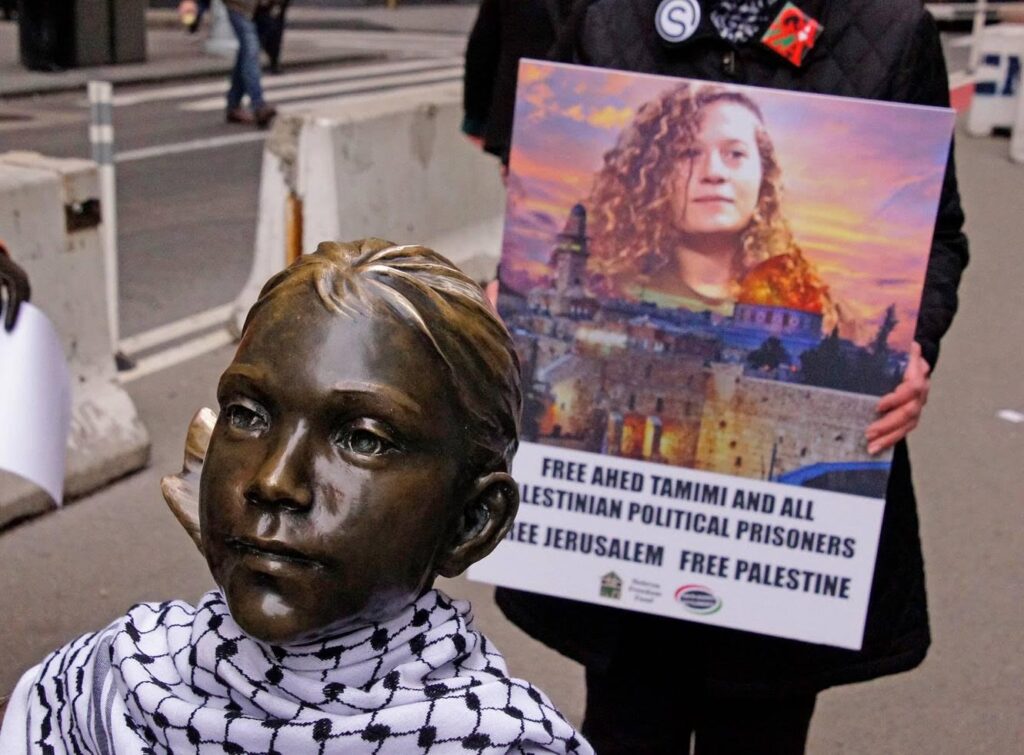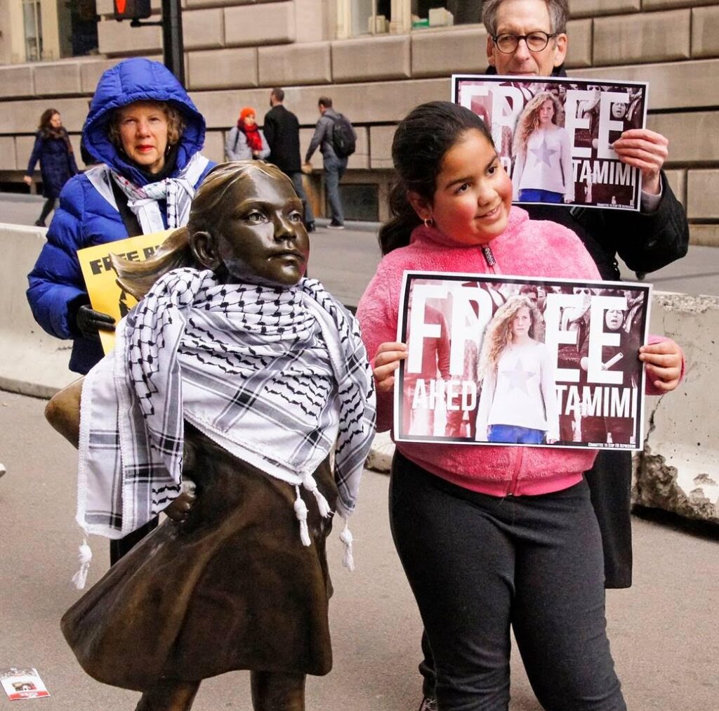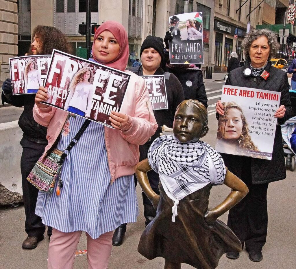New Yorkers gathered at the “Fearless Girl” statue on Wall Street on 9 April to salute a true example of a fearless girl, 17-year-old imprisoned Palestinian activist Ahed Tamimi. A group of activists with Samidoun Palestinian Prisoner Solidarity Network gathered with signs and information about Ahed’s case on 9 March, draping the statue with a keffiyeh to represent Ahed. The statue, which faces the Wall Street “bull” of the stock market, is a famous attraction and many tourists and passers-by visit it on a daily basis.