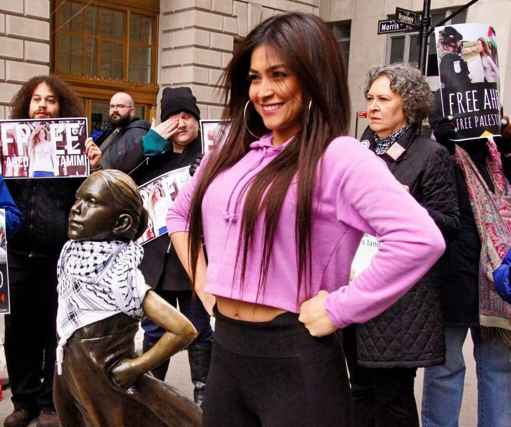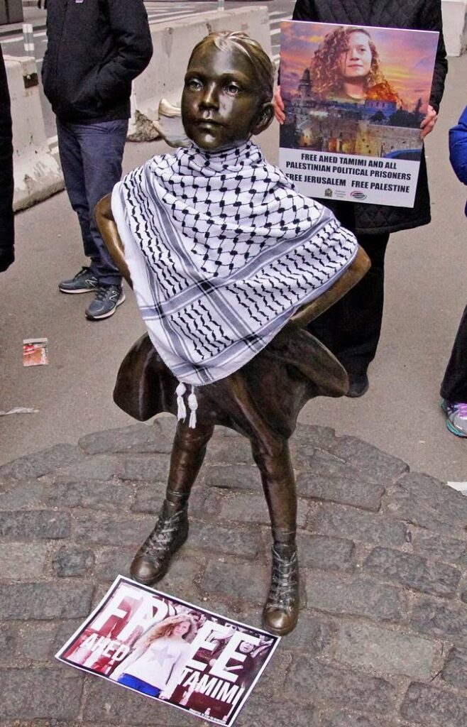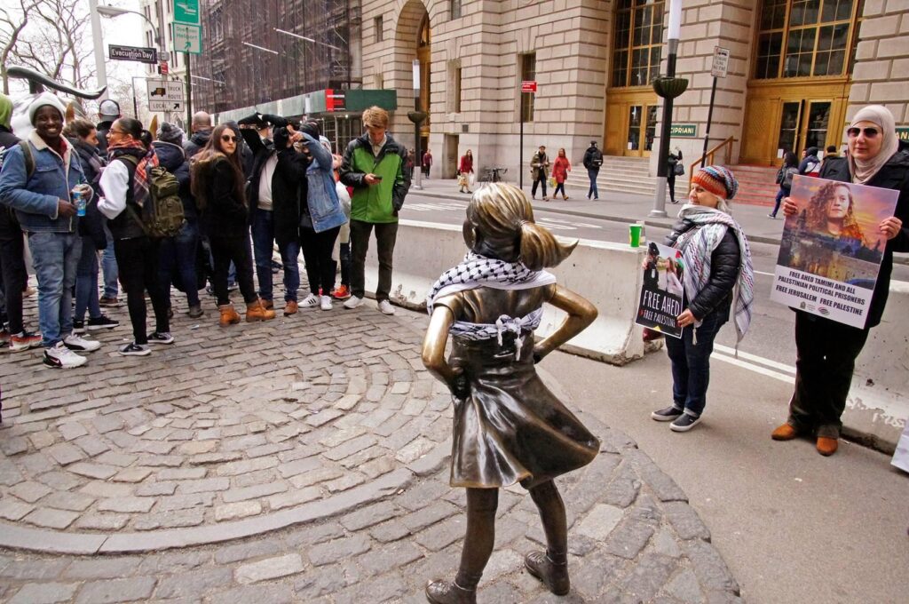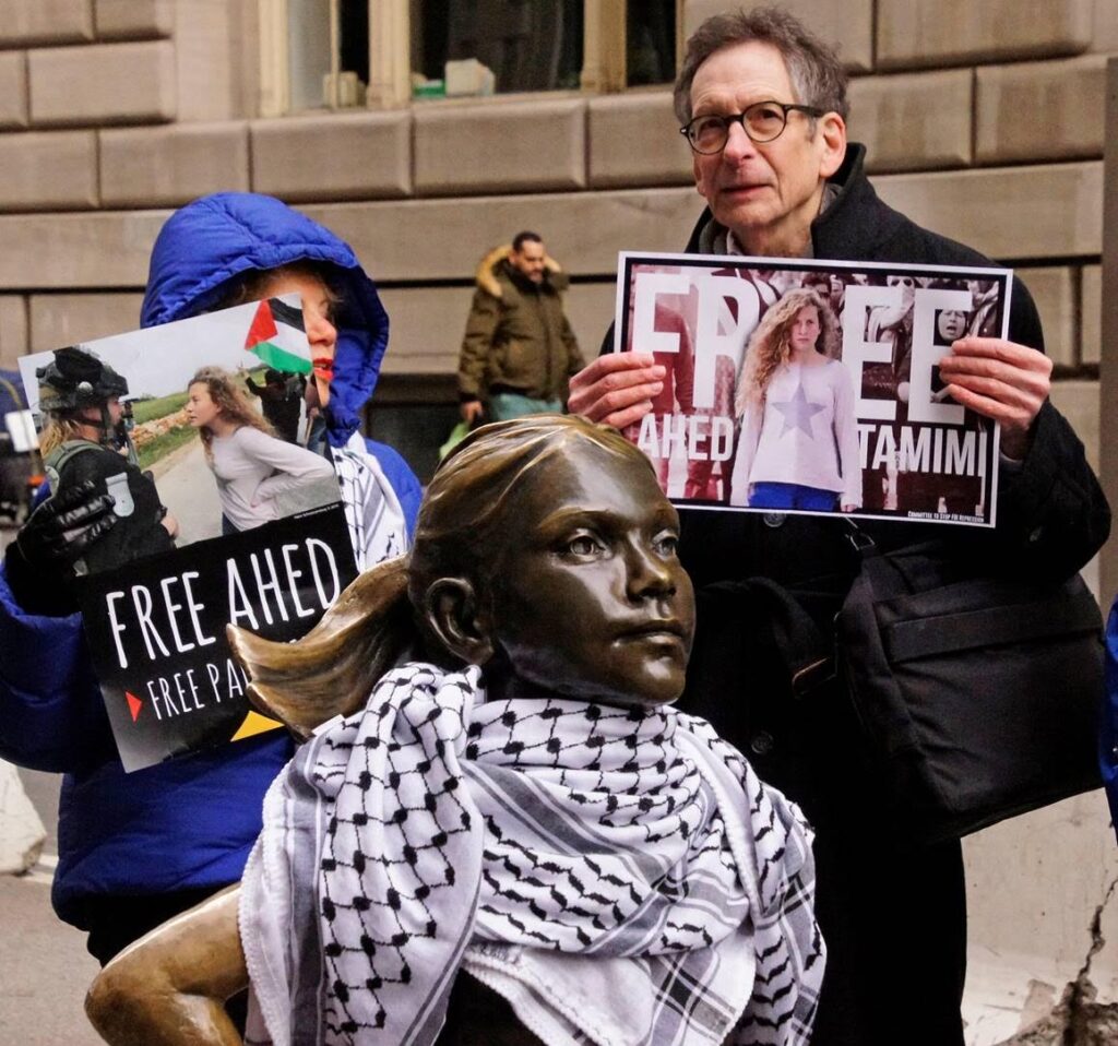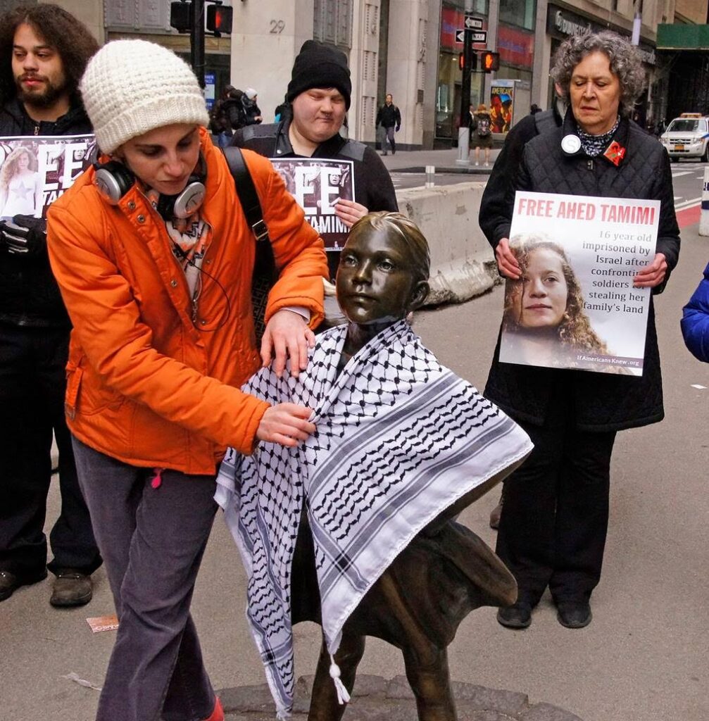 New Yorkers gathered at the “Fearless Girl” statue on Wall Street on 9 April to salute a true example of a fearless girl, 17-year-old imprisoned Palestinian activist Ahed Tamimi. A group of activists with Samidoun Palestinian Prisoner Solidarity Network gathered with signs and information about Ahed’s case on 9 March, draping the statue with a keffiyeh to represent Ahed. The statue, which faces the Wall Street “bull” of the stock market, is a famous attraction and many tourists and passers-by visit it on a daily basis.