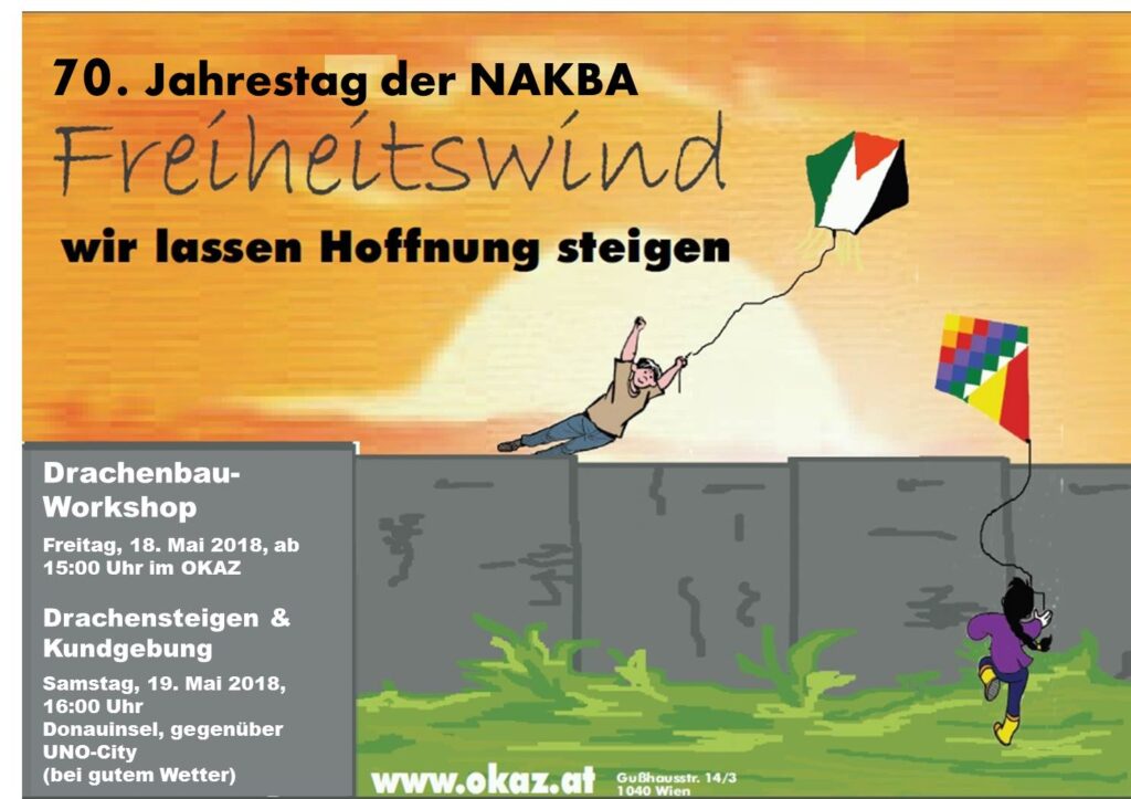 On the occasion of 70 years of Nakba, we stand with the Palestinians in the occupied homeland and in the diaspora. On Friday, 1 June, the OKAZ will hold a kite-making workshop for children and adults. At 3 pm on Saturday, 2 June, the kites will fly on the Danube Island in front of the UN Building. Freedom for Palestine!