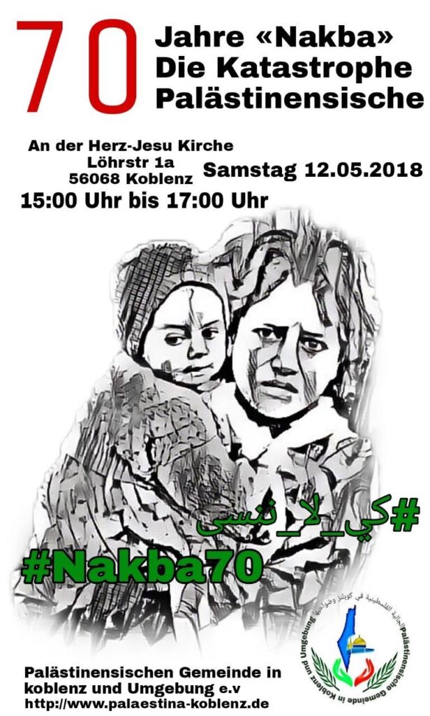 تدعو الجالية الفلسطينية في كوبلنز وضواحيها وكل محبي الحرية إلى وقفة إحتجاجية وتضامنية مع الشعب الفلسطيني في الذكرى ال 70 عام للنكبة الفلسطينية يوم تشريد الشعب الفلسطيني من دياره وكذلك تضامنا مع أسرى الحرية أسرى الشعب الفلسطيني في السجون والمعتقلات الإسرائيلية.