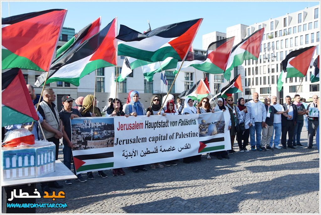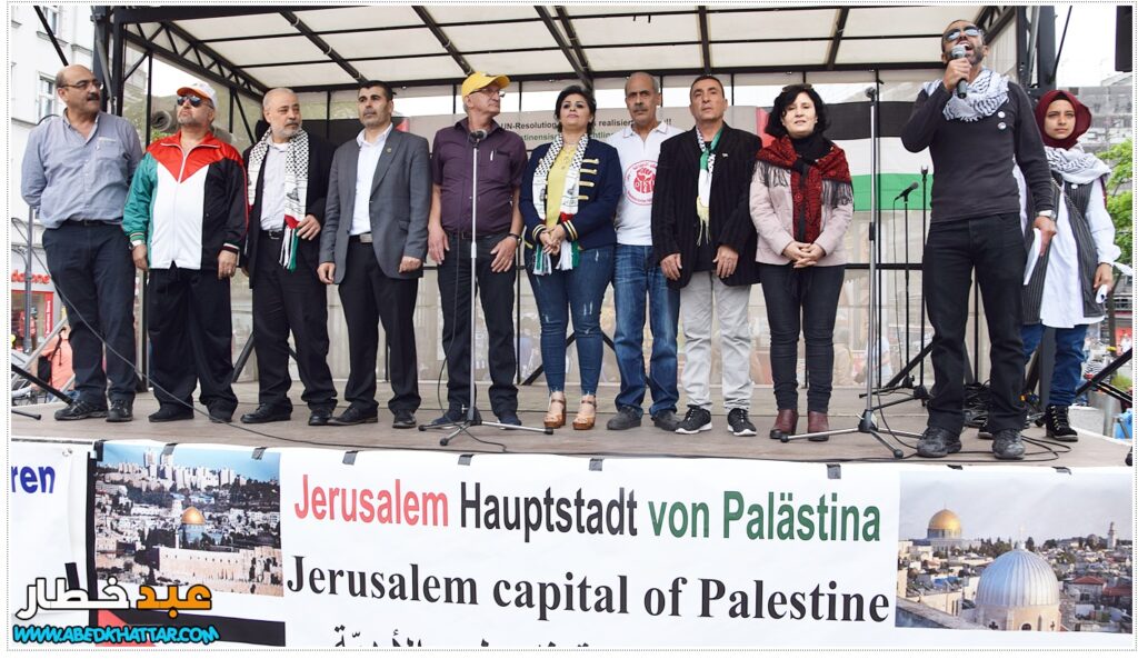 Speakers denounced the role of the United States and the move of its embassy to Jerusalem, demanding the liberation of Jerusalem and all of Palestine. Representing Palestinian organizations, solidarity groups and political parties like the Marxist-Leninist Party of Germany (MLPD), speakers emphasized their stand with the Palestinian people and the continuing struggle of Palestinians over 70 years of Nakba.
