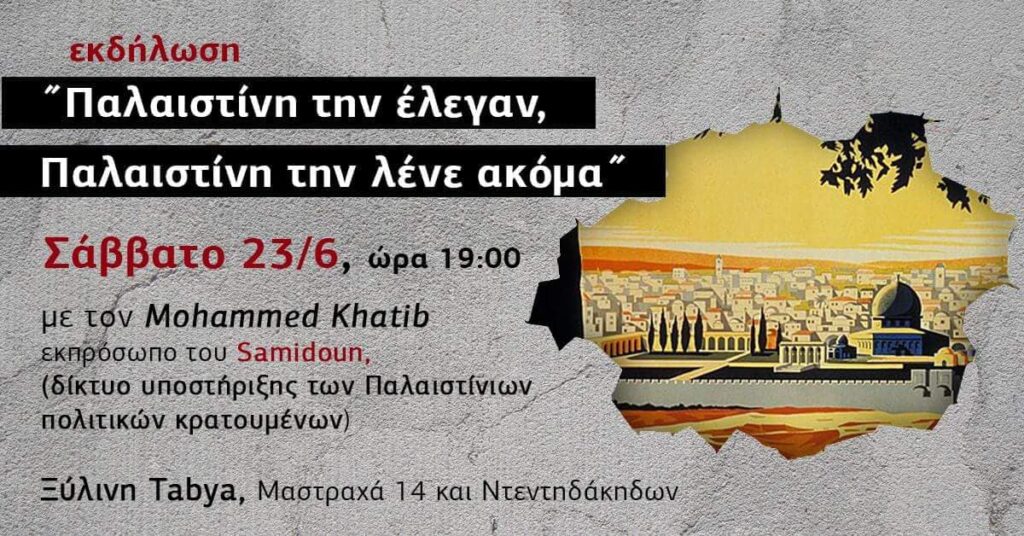 Θα είμαστε παρέα, να συζητήσουμε με τον Mohammed Khatib, εκπρόσωπο του δικτύου αλληλεγγύης Παλαιστίνιων κρατουμένων Samidoun. Θα ενημερωθούμε για την τρέχουσα κατάσταση στην Παλαιστίνη, ειδικότερα μετά την έμμεση αναγνώριση της Ιερουσαλήμ ως πρωτεύουσας του Ισραήλ και μεταφορά εκεί της πρεσβείας των ΗΠΑ.