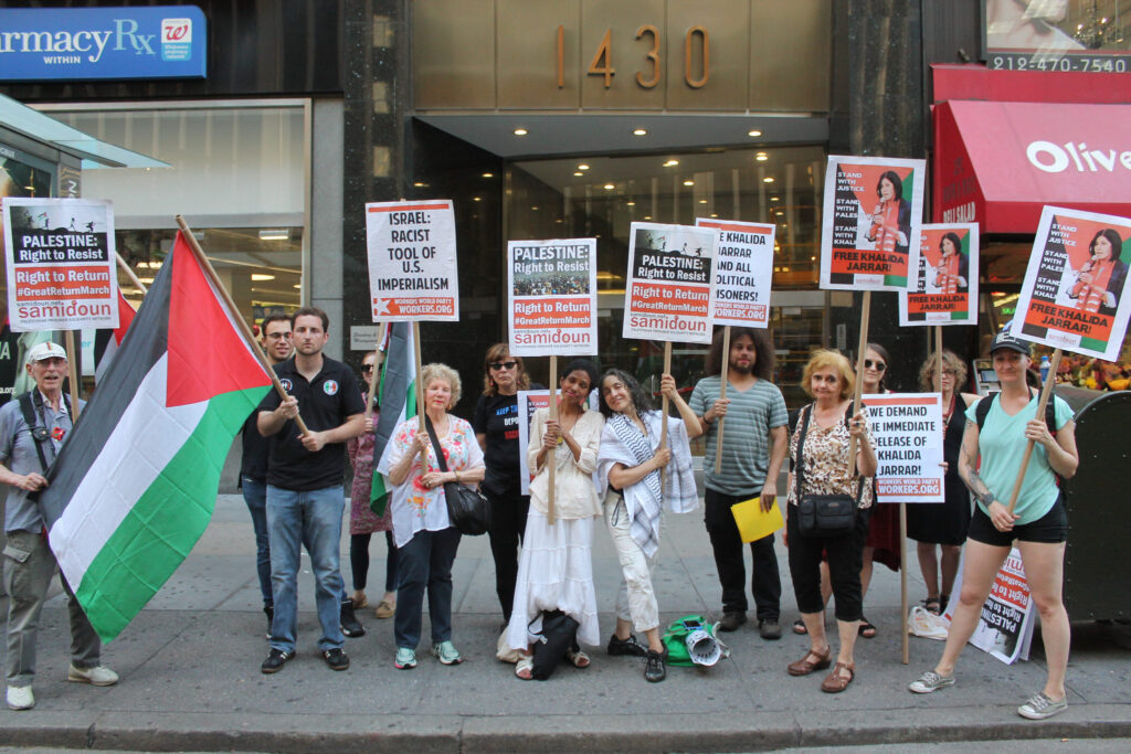 New Yorkers demonstrated outside the offices of the “Friends of the IDF,” an organization that raises money for the Israeli occupation army, demanding Jarrar’s release, on 30 June. Samidoun activists and others distributed information and material about her case and the situation of Palestinian political prisoners in Israeli jails.