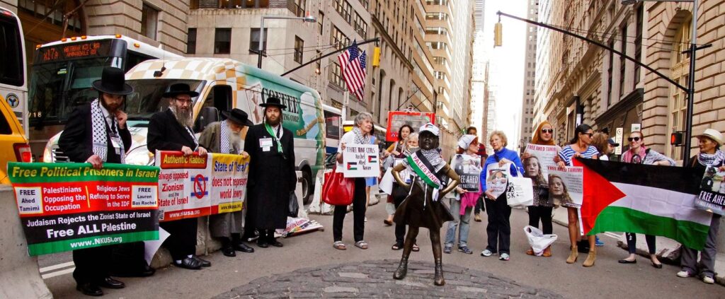 Joining the activists at the protest were a group of anti-Zionist Orthodox Jews from the Neturei Karta, who brought signs and banners espousing their support, from a religious perspective, for Palestinian liberation and their opposition to the Israeli state.