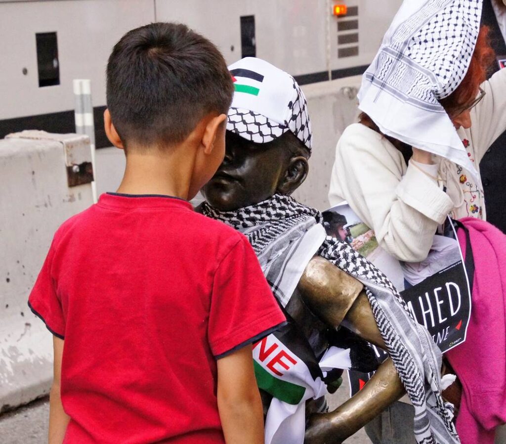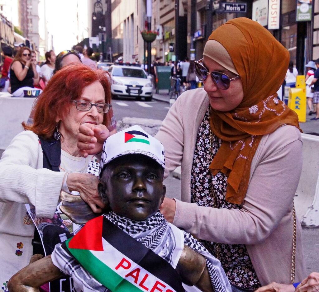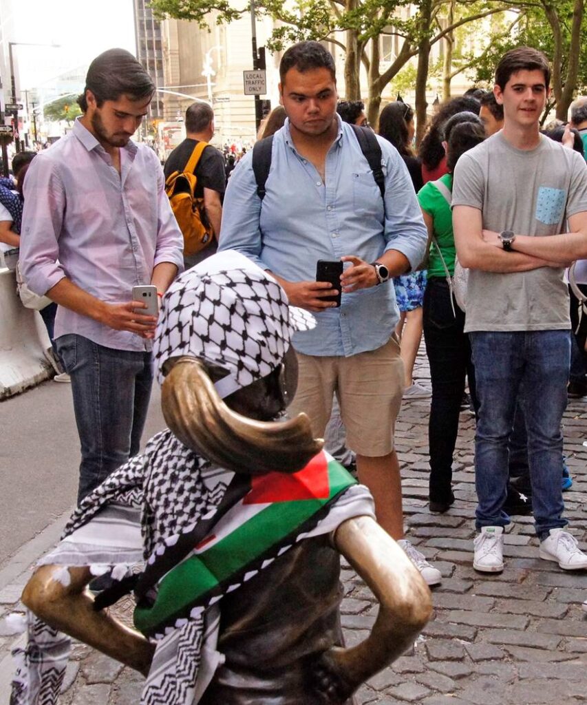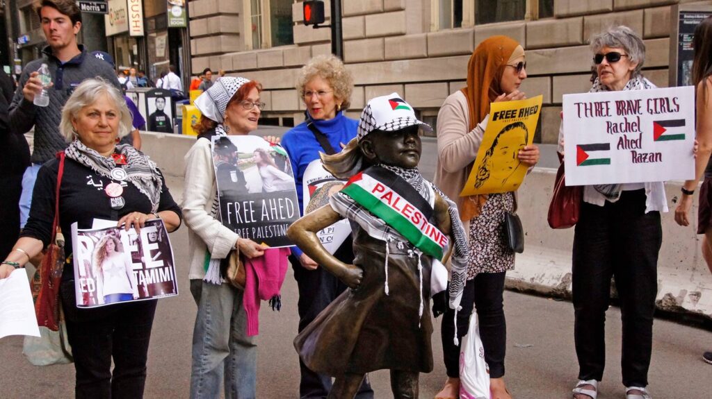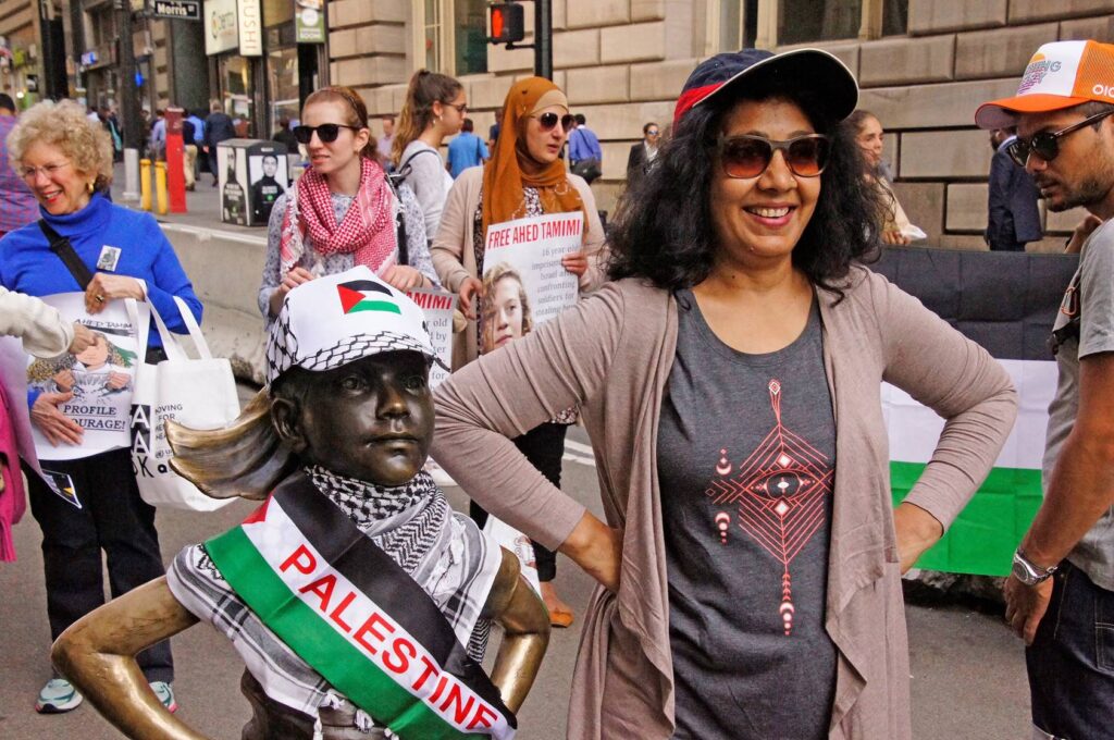 Located in this prime tourist location, the action drew the attention of a wide range of New Yorkers and visitors, many of whom chose to be photographed with the statue dressed as Ahed. Many international tourists had heard about Ahed’s case, including a British journalist visiting the city with his family.