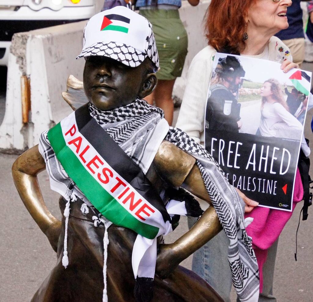 The New York protest, organized by activists with Samidoun Palestinian Prisoner Solidarity Network and other local organizations, included the dressing of the famous statue, which faces the Wall Street Bull, in a kuffiyeh, “Free Palestine” cap and Palestine flag scarf worn as a sash. Participants distributed flyers and information about Ahed’s case and the imprisonment of Palestinian children while holding signs and posters demanding freedom for Ahed Tamimi and all Palestinian prisoners.