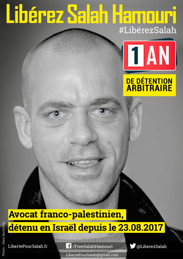 One year ago, on 23 August 2017, our compatriot Salah Hamouri was arrested in the middle of the night, at his home in Jerusalem, by the Israei army. Three days before, he was sworn in before the Ramallah Bar; he became a lawyer and could finally put his energy into defending the human rights of his fellow Palestinians in a professional and formal manner.
