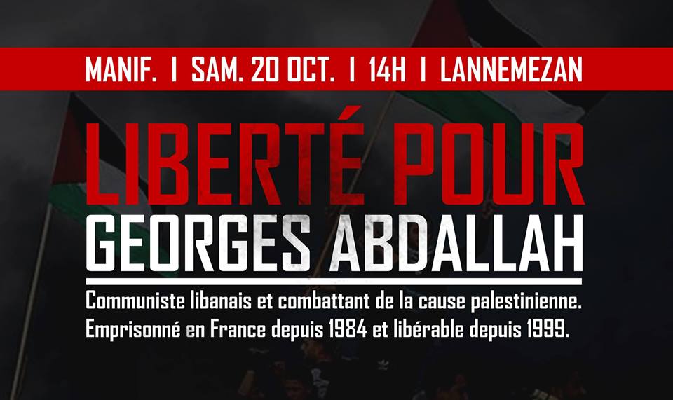 Annual demonstration of the unified campaign for the liberation of Georges Abdallah to the gates of the prison of Lannemezan. Gather at the Lannemezan station at 2:00 pm. Georges Abdallah is a Lebanese communist struggler and a fighter for the Palestinian cause imprisoned in France since 1984 and released since 1999. He will begin his 35th year of detention in October, making him one of the longest-held political prisoners in the world.