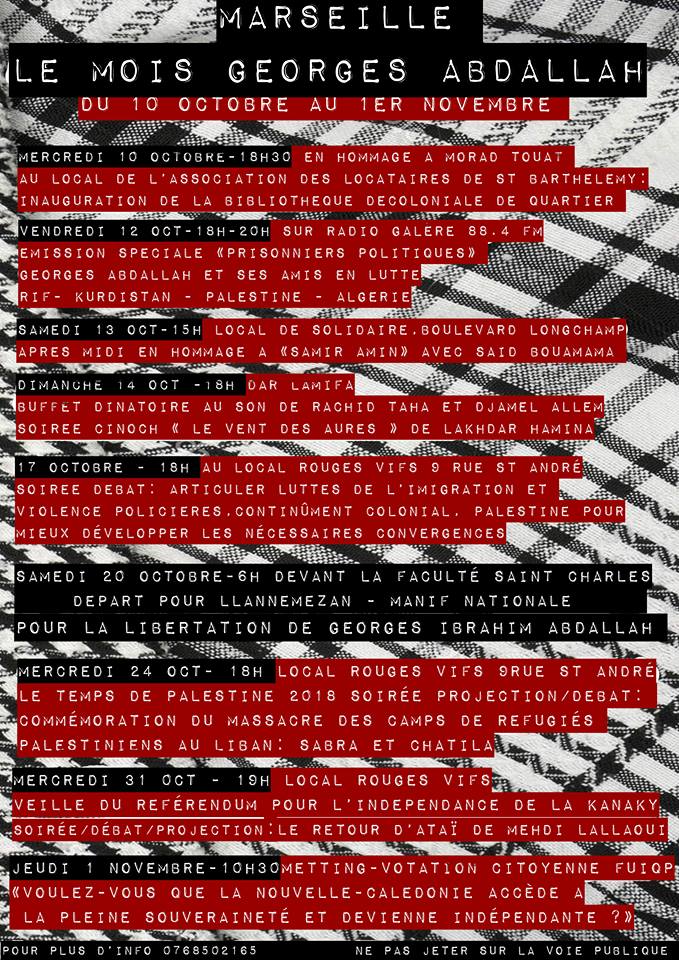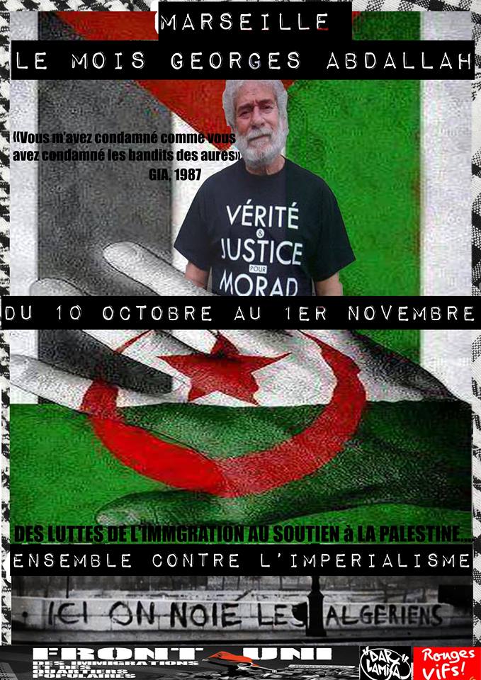 Un mois de soutien à Georges Ibrahim Abdallah à Marseille en vu_ de préparer la manifestation nationale exigeant sa libération au centre pénitentiaire de Lanemezan…Georges entame sa 35ieme année de prison :il est un prisonnier politique enfermé pour son soutien à la Palestine…