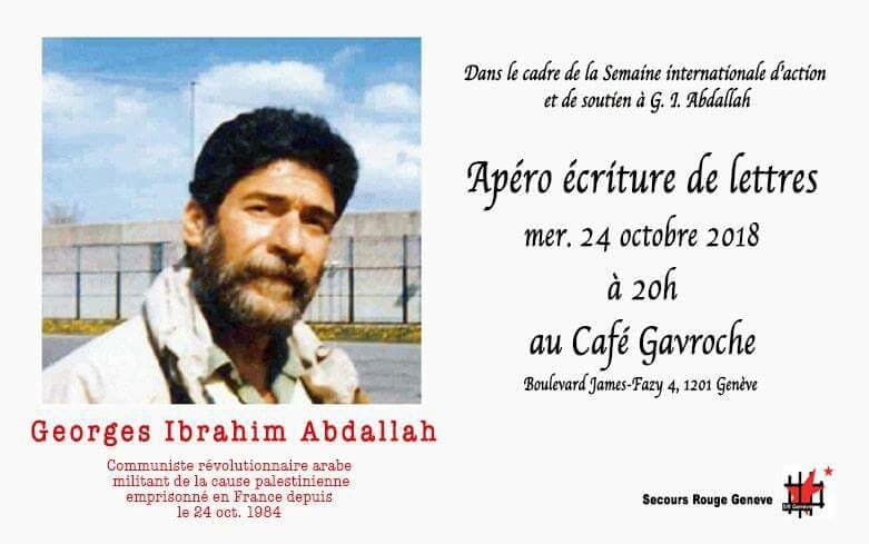 Dans le cadre de la semaine internationale de soutien à Georges Abdallah le Secours Rouge Genève organise un apéro écriture de lettres.