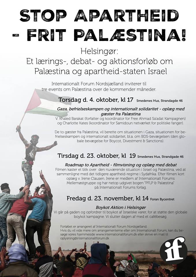 Den 23. oktober kl 19, viser vi filmen Roadmap to Apartheid og lægger op til debat, med oplæg fra Irene Clausen. Event her: https://www.facebook.com/events/367791133761433/