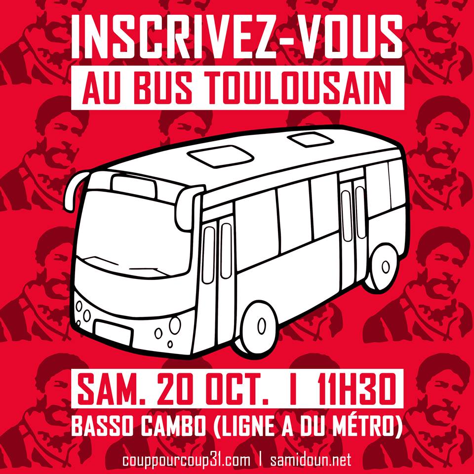 The bus from Toulouse, funded by donations, will leave at 11:30 am from the Basso Cambo metro station. Participants can register for the bus by emailing couppourcoup31@gmail.com.