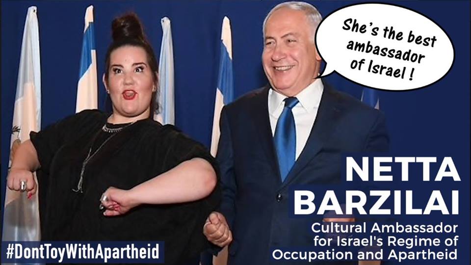 The Palestinian Campaign for the Academic and Cultural Boycott of Israeli (PACBI)’s statement on Netta Barzilai’s cultural ambassadorship: https://bdsmovement.net/news/netta-barzilai-cultural-ambassador-israels-regime-occupation-and-apartheid