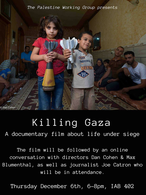 Come to the Palestine Working Group’s last event of the semester and the last one by the 2018 Board. We’ll be screening Dan Cohen and Max Blumenthal’s unforgettable documentary film, Killing Gaza. Dan and Max will Skype in to comment and take any questions by the audience. Joe Catron, a journalist/activist who lived in Gaza for three and a half years from 2011 to 2014, will join us in person to offer his reflections on the film and his time being on the ground.