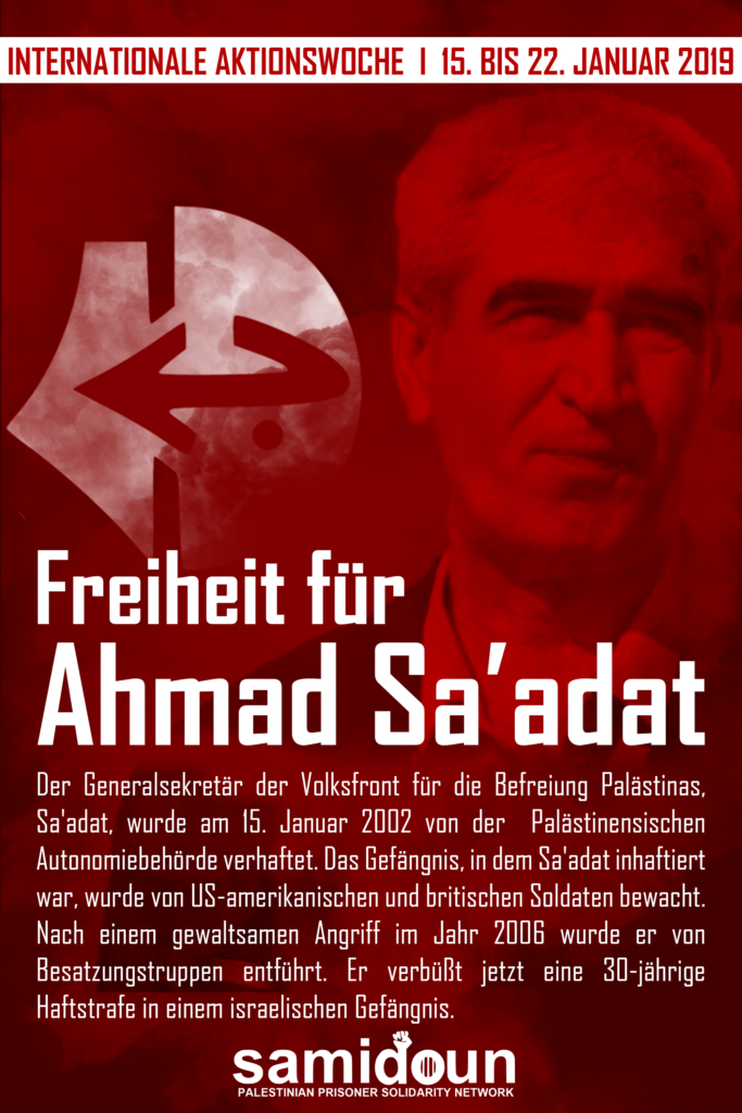 في اطار ” الاسبوع الأممي للتضامن مع القائد الوطني الأسير أحمد سعدات ” و بالتعاون مع ” حملة تحرير المناضل العربي والأممي جورج عبد الله ” المعتقل في السجون الفرنسية ، تدعوكم شبكة صامدون للدّفاع عن الأسرى الى ندوة حوارية في برلين ( الأسرى والنضال من أجل التحرير ) يوم الاحد الموافق 13 يناير / كانون الثاني 2019 في تمام الساعة السادسة مساءً .