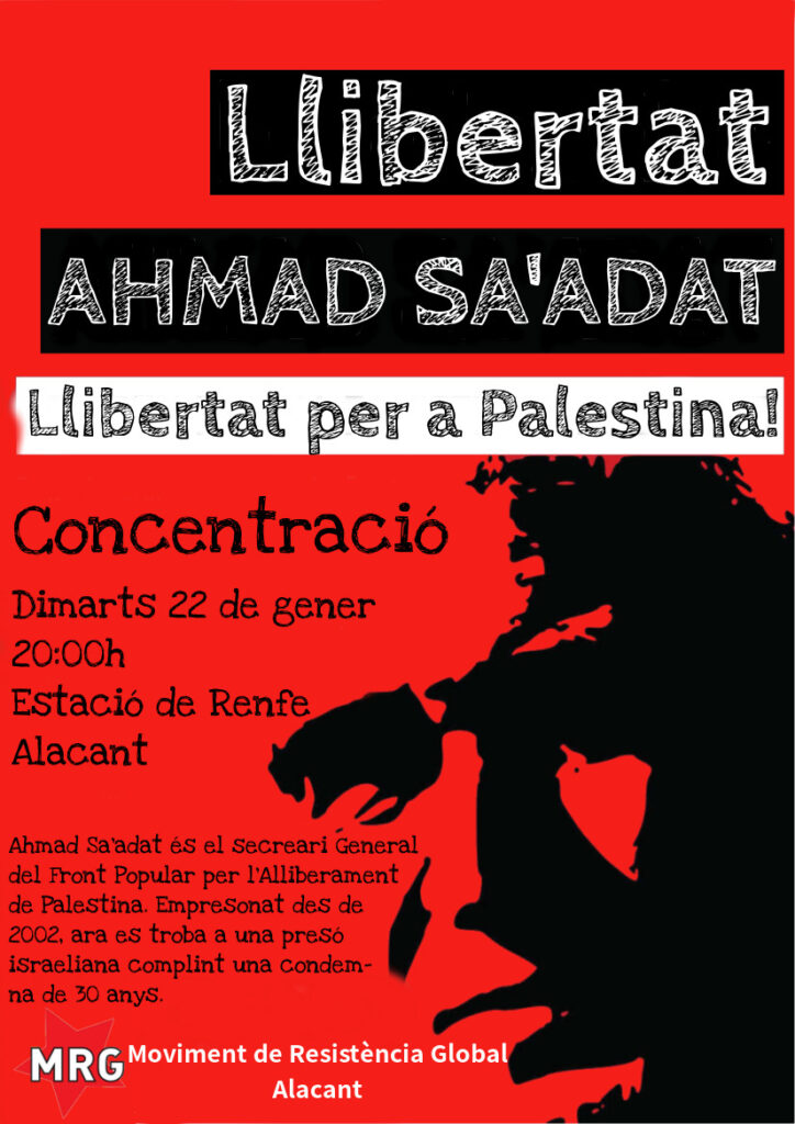 Ahmad Sa’adat es el Secreari General del Front Popular per l’Alliberament de Palestina. Empresonat des de 2002, ara es trobe a una preso israeliana comlint un condemna de 30 anys.