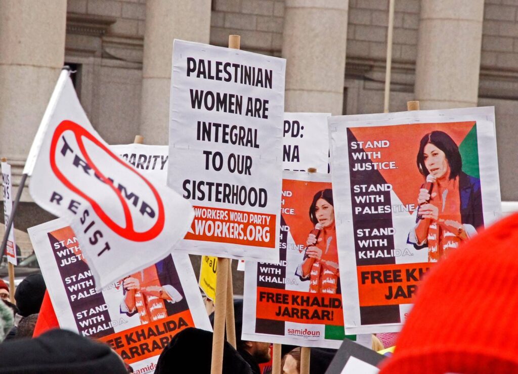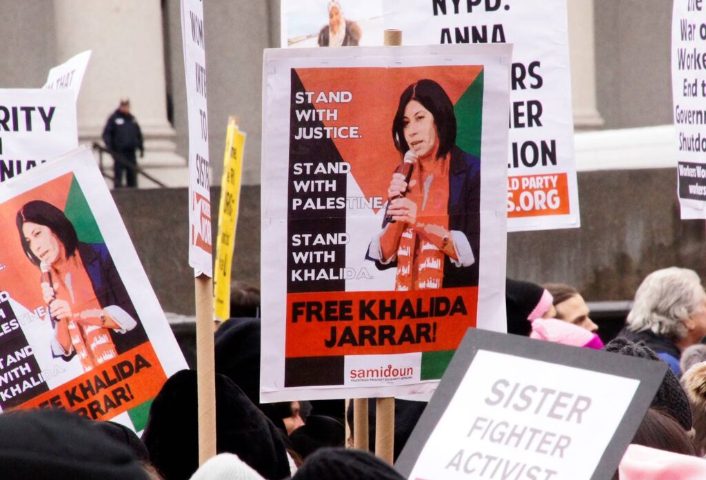 Samidoun Palestinian Prisoner Solidarity Network joined with other advocates for Palestine to organize a bloc in the Women’s March in New York City in solidarity with Khalida Jarrar and Palestinian women prisoners in Israeli jails. The Samidoun bloc joined the Women’s Unity Rally at Foley Square on Saturday, 19 January, carrying signs urging freedom for Jarrar, the imprisoned Palestinian parliamentarian, leftist, feminist and political leader, held without charge or trial under administrative detention.