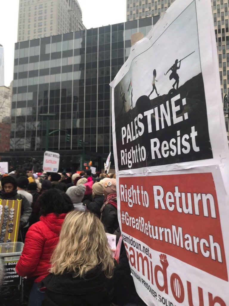 Jarrar, the former Executive Director of Addameer Prisoner Support and Human Rights Association, has been imprisoned since July 2017 without charge or trial. Her administrative detention has been repeatedly renewed on the basis of so-called “secret evidence.” The contingent in the Women’s March highlighted her case as a critical example for international support and solidarity to demand her immediate release and the end of her administrative detention. Protesters emphasized the importance of supporting Palestinian women’s struggle and the liberation of all of Palestine.