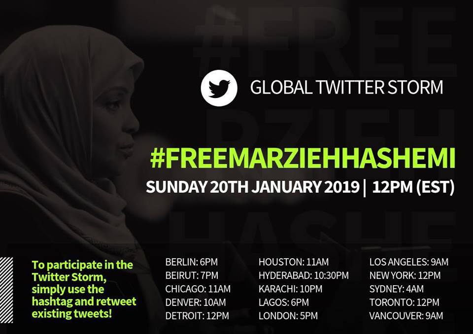 We believe in the POWER OF THE PEOPLE. Help up create a Twitter Storm using the hashtag #FreeMarziehHashemi this Sunday at 12 PM (EST)