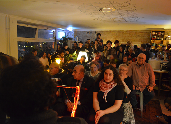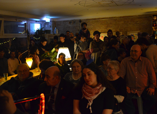 On Wednesday evening, 27 March, Rasmea Odeh‘s voice and words were heard in Berlin, Germany, despite a harsh, repressive campaign that included yet another ban on her speaking in person issued by Berlin’s Senator for the Interior. The successful event at be’kech in Berlin’s Wedding district brought crowds to the space despite a large police presence; the space was so crowded that many people stayed outside to watch the event through glass windows.