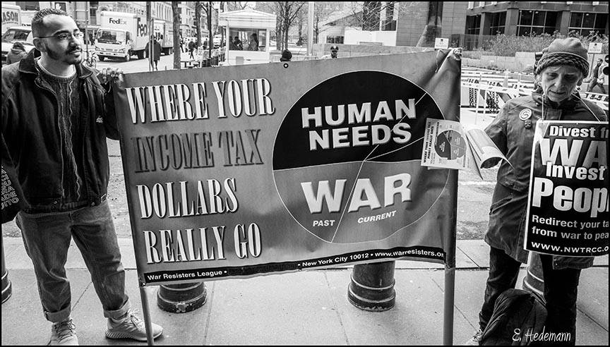 Demonstration in front of the Internal Revenue Service building (at Duane St.) in lower Manhattan to protest tax dollars being spent on U.S. wars and the military, and support those who openly refuse payment for these wars but, instead, reroute their tax dollars from the IRS to groups desperately in need of funding.