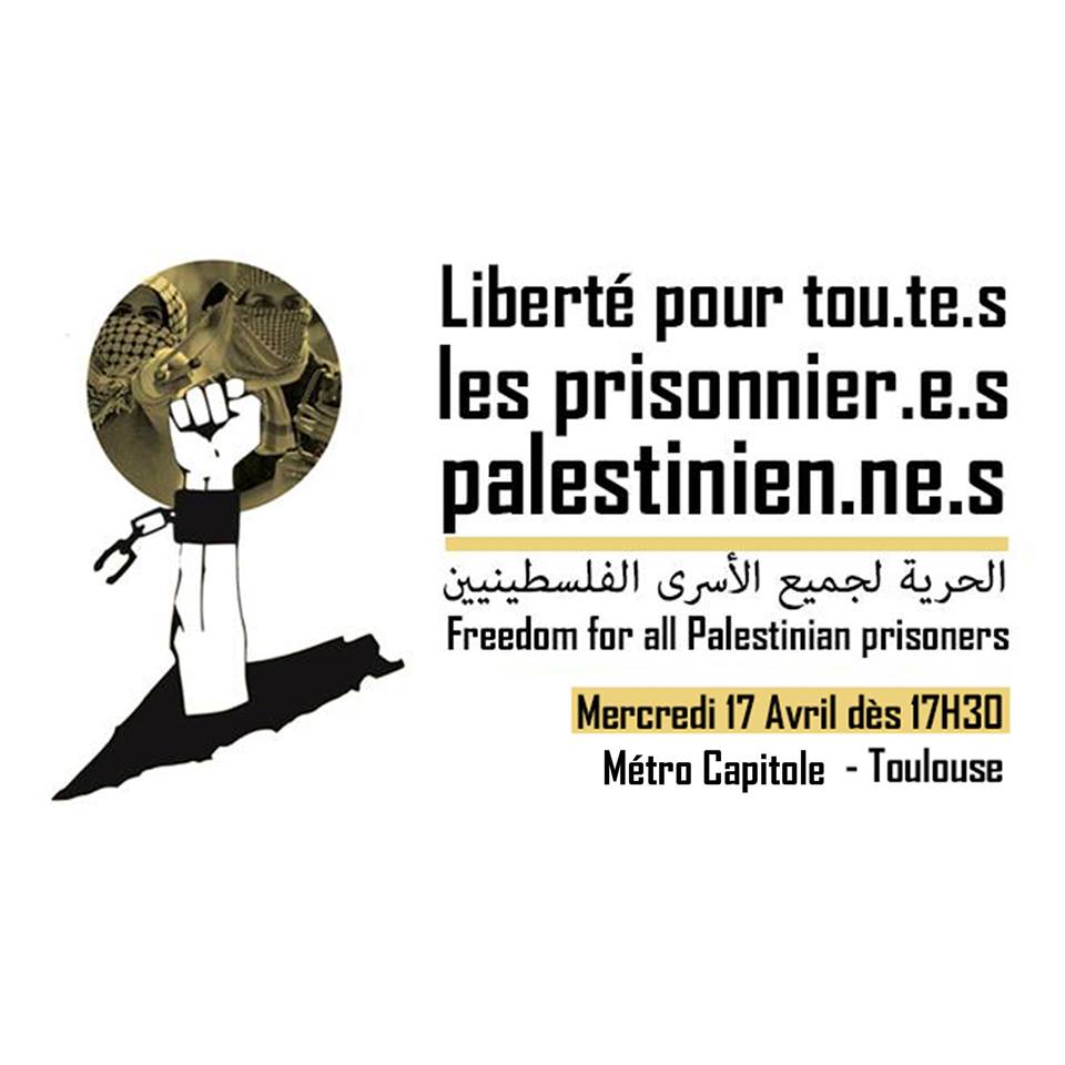Le Temps de la Palestine Toulouse appelle à un rassemblement mercredi 17 avril de 17h30 à 19h au métro Capitole à Toulouse à l’occasion de la Journée de Solidarité avec les prisonnier.er.s palestinien.ne.s. Au programme : atelier d’écriture aux prisonnier.e.s, photos, musique, diffusion de flyers, prises de parole…