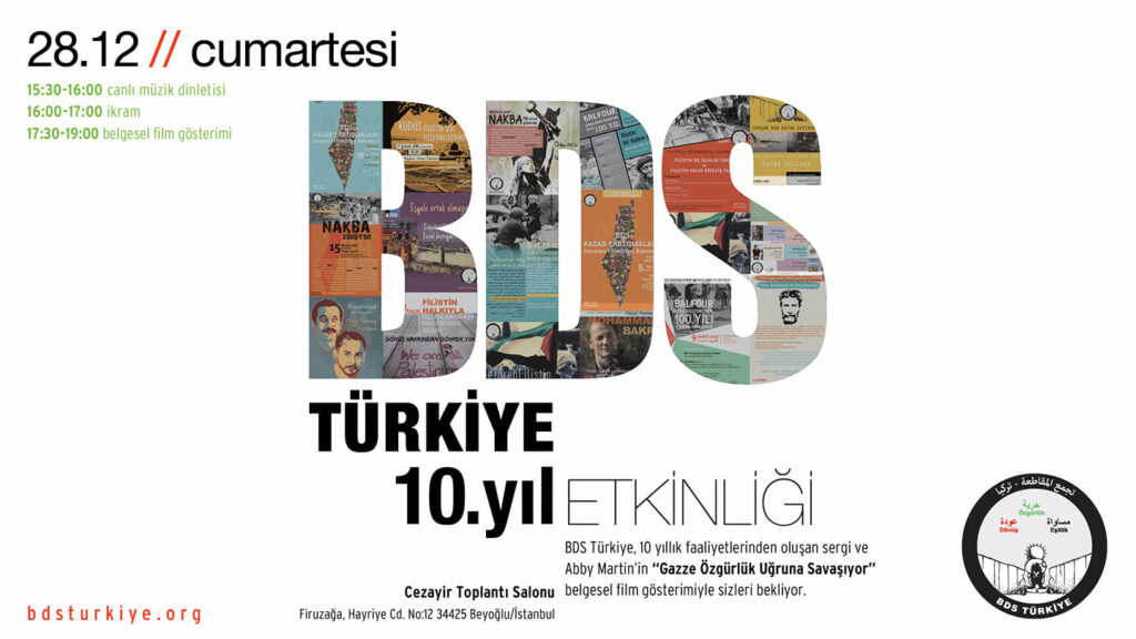 On 27 December 2009, the Boycott Israel Initiative for Palestine was launched on the first anniversary of Operation Cast Lead, Israel’s attack on Gaza. Since 2014, BDS Turkey, in coordination with the international BDS campaign, has continued the campaign. The end of 2019 marks our 10th year of organizing. Join BDS Turkey to celebrate this 10th anniversary.