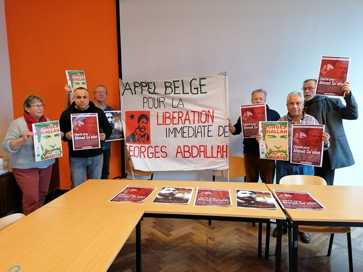 In Charleroi, Belgium, members and supporters of the Plate-Forme Charleroi-Palestine took time during their educational meeting about the popular movement in Lebanon to show their solidarity with Georges Abdallah, Ahmad Sa’adat and all Palestinian prisoners.