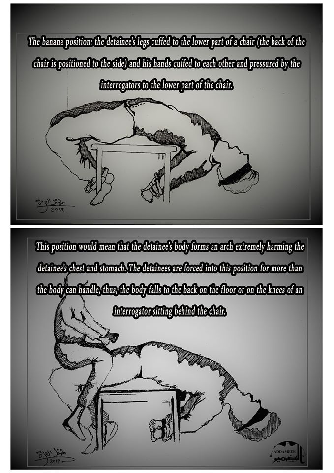 Later, Mays was transferred to the Moskobiyeh interrogation center. She was strip-searched and then transferred to the interrogation cells. She recalled that her interrogations lasted for many hours at a time while she was shackled to a small chair inside a very cold cell. After six days, the “military interrogation” began with her, which included the use of stress positions like the “banana” and “squatting” or the “false chair” for long periods of time, in an attempt to coerce a false confession from her.