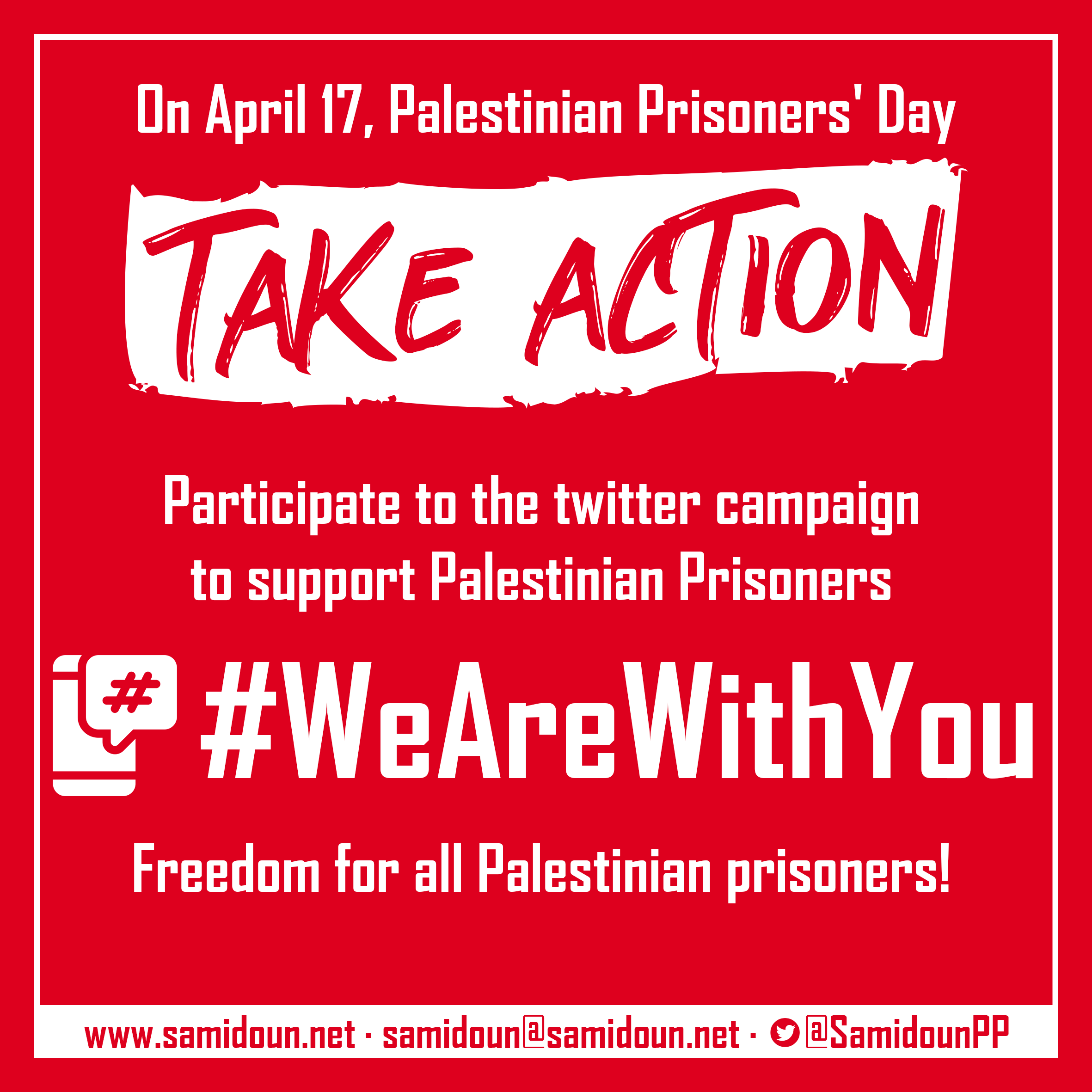 On Friday, 17 April, Palestinian Prisoners’ Day, Samidoun Palestinian Prisoner Solidarity Network will be joining with groups and activists around the world to tweet our collective, symbolic solidarity with Palestinian prisoners in Israeli jails. Follow @SamidounPP on Twitter for updates, news and more on the struggle of Palestinian prisoners and to follow the Twitterstorm!