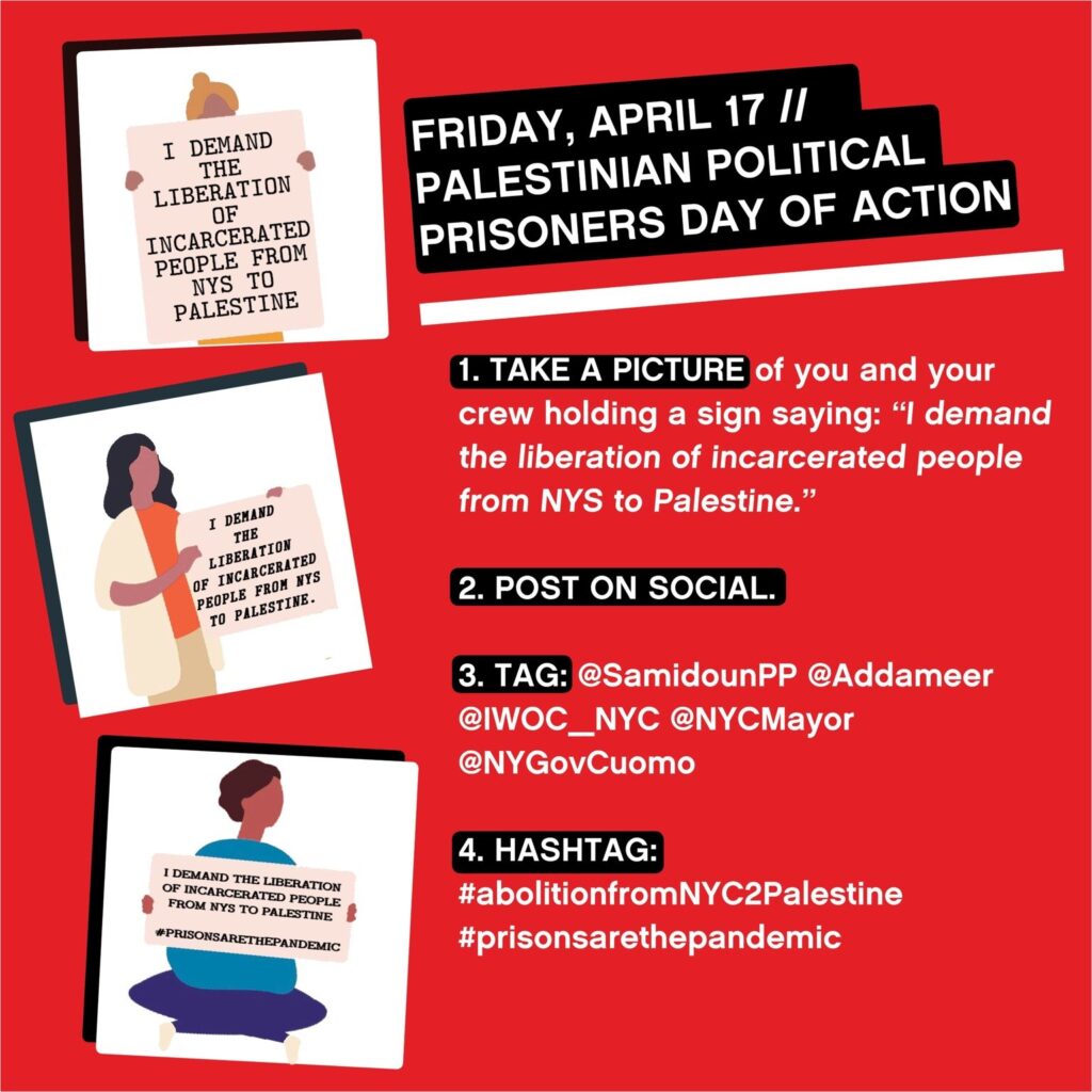 Samidoun Palestinian Prisoner Solidarity Network strongly supports this pressing call to action by the Incarcerated Workers Organizing Committee – New York City and Free Them All for Public Health and urges broad participation in it by all defenders of Palestine, Palestinian political prisoners, and the prisoners’ movement. To learn more and boost the campaign, see these organizations’ social media toolkit and follow their Twitter and Instagram accounts, as well as the hashtag #AbolitionFromNYC2Palestine.