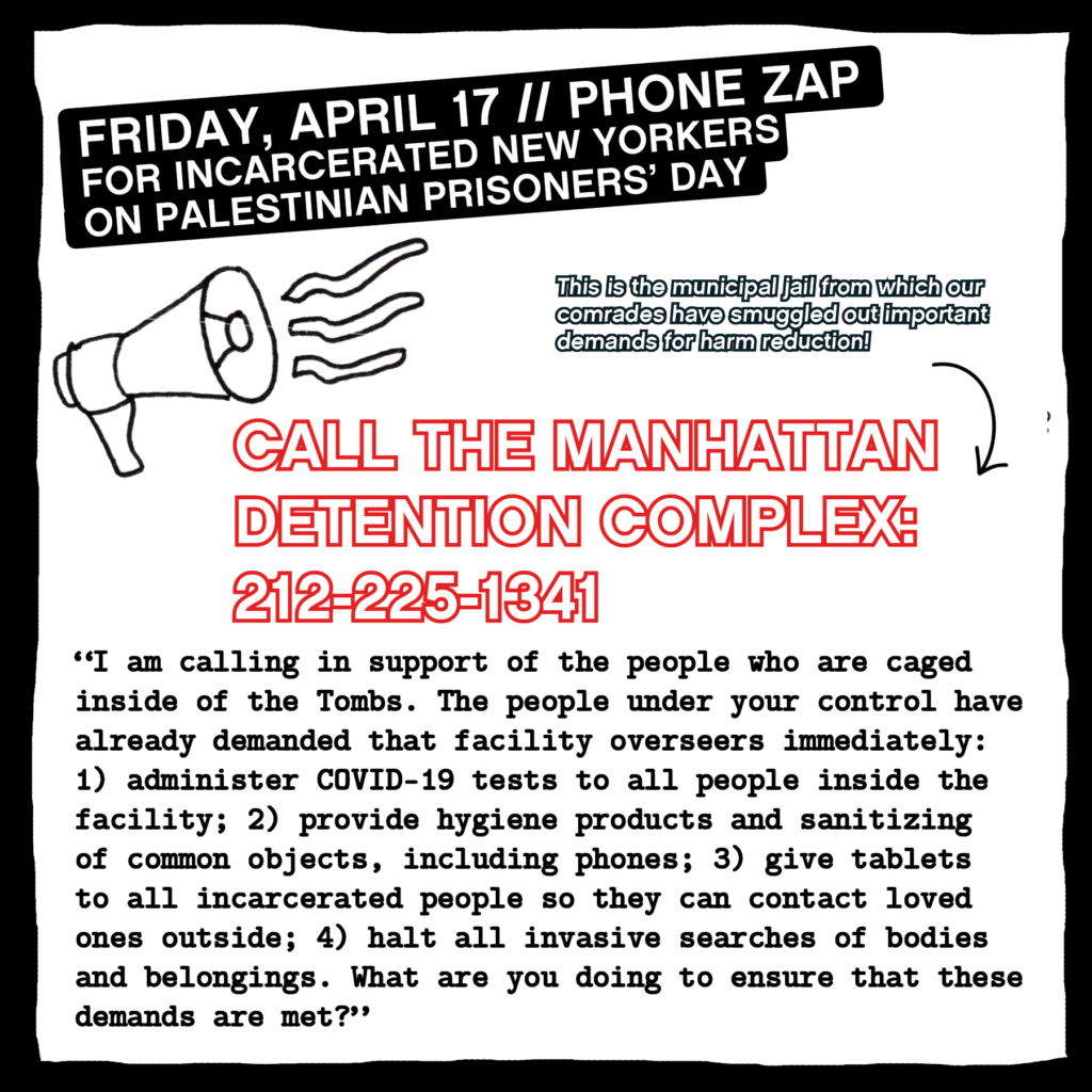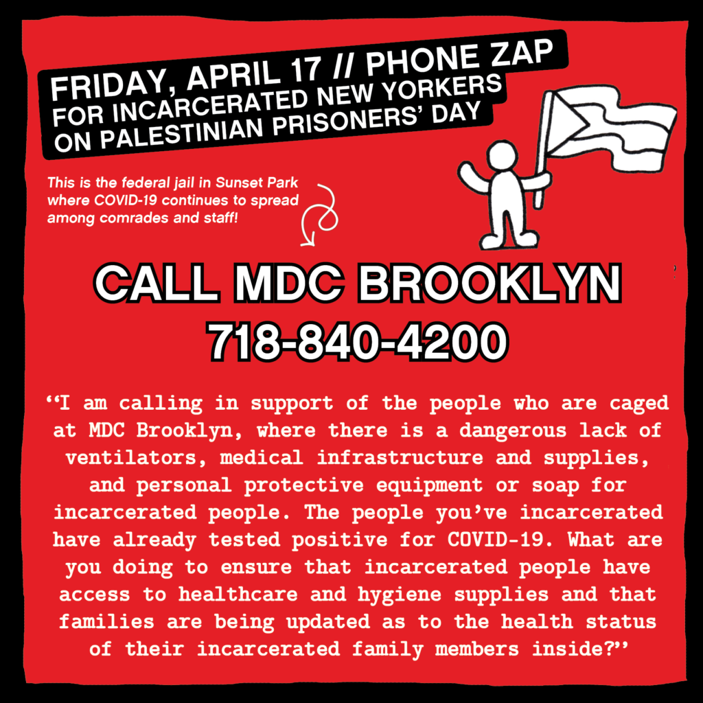 This Friday, April 17, is Palestinian Prisoners’ Day, and abolitionists of NYC stand in solidarity with Palestinian freedom fighters caged by the Israeli occupation. As COVID-19 continues to spread inside carceral sites around the world, demands for safety and liberation are pouring out from behind the walls.